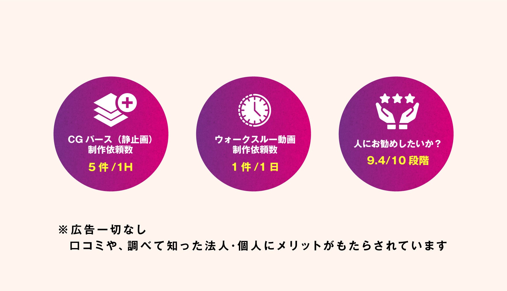 お陰様で引き続き毎月新しいお客様からのご依頼があります。(順調というよりも、案件過多でギリギリやれている状況です。)静止画の建築CGパースは【1時間に5件】の依頼、ウォークスルー動画は【1日1件】の依頼があります。広告費用・営業費用はほぼ0円で、大手・著名デザイナーからフリーランスの方まで、お客様からの紹介紹介で広がっております。