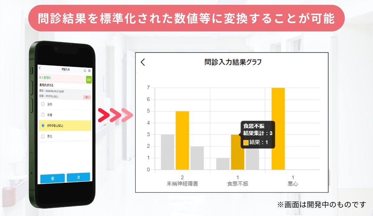 また、患者自身も、同じ問診をした他の患者の結果の統計値等と比較することができ、自身の体調をより客観的に評価しやすくなるという効果があります。