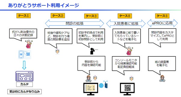 患者のサーベイランスや入院時のチェックシート、研究におけるePROなど、施設の実情に応じて様々な用途が考えられます。