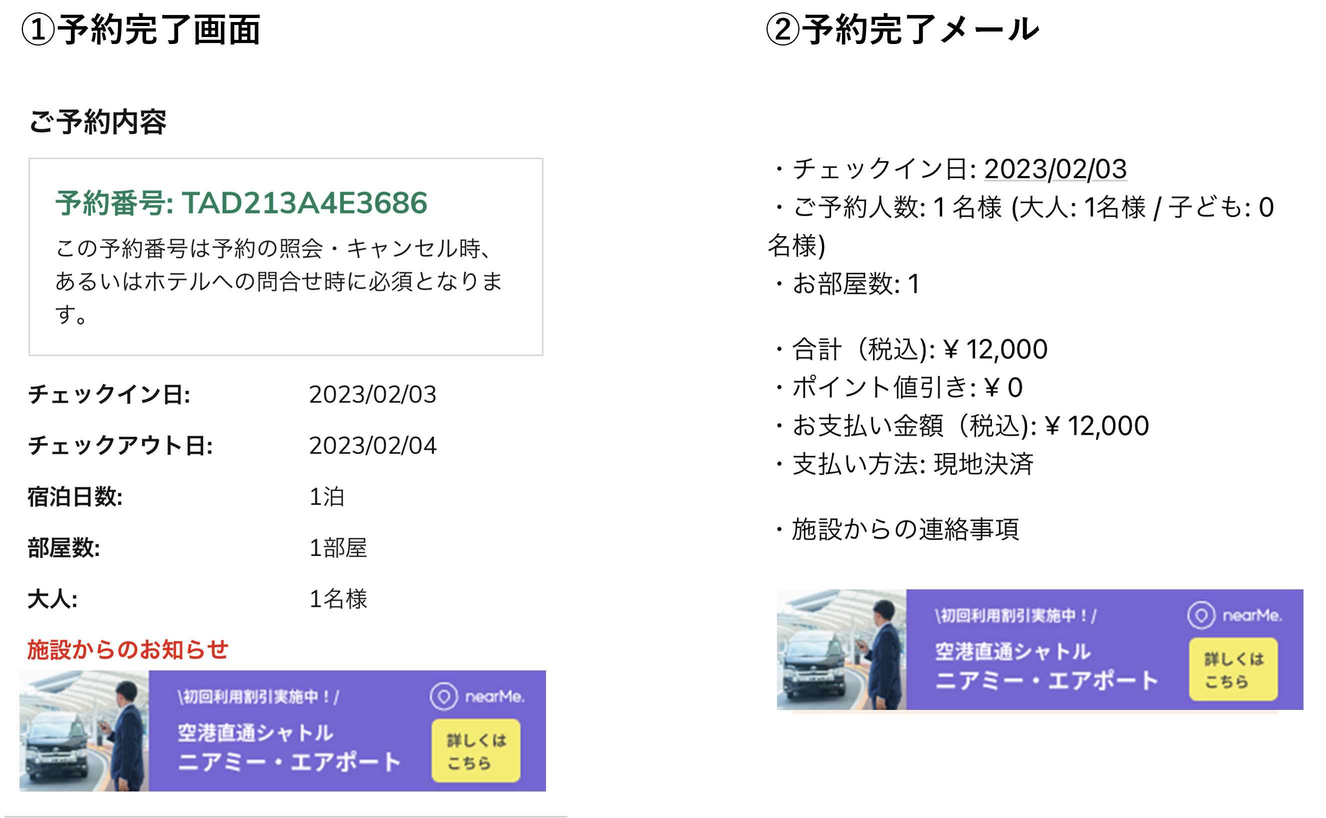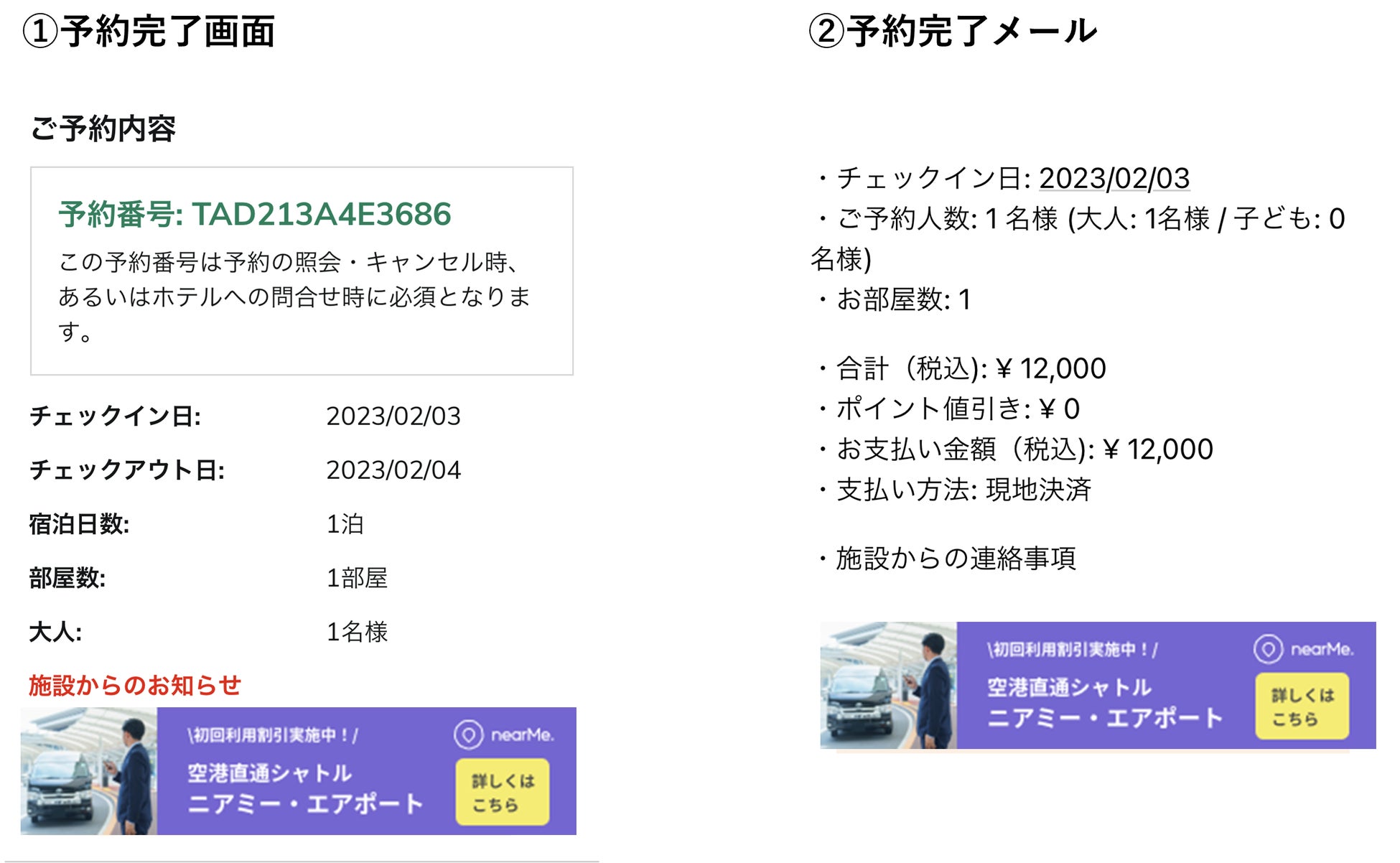 トリプラで宿泊予約をすると、宿泊予約完了時の予約完了画面と予約完了メールなどに「nearMe.Airport」のバナーが掲載されます。