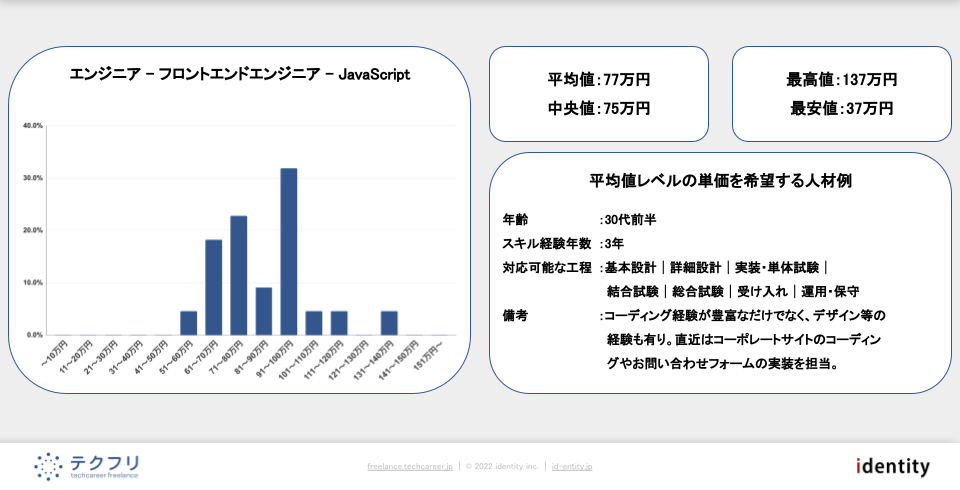 ITフリーランスエンジニアの案件・求人サイト「テクフリ」(https://freelance.techcareer.jp/)を運営する株式会社アイデンティティー(東京都新宿区、以下「当社」)は本日、「ITフリーランスの相場Vol.1 - フロントエンドエンジニア編」を作成・公開しました。