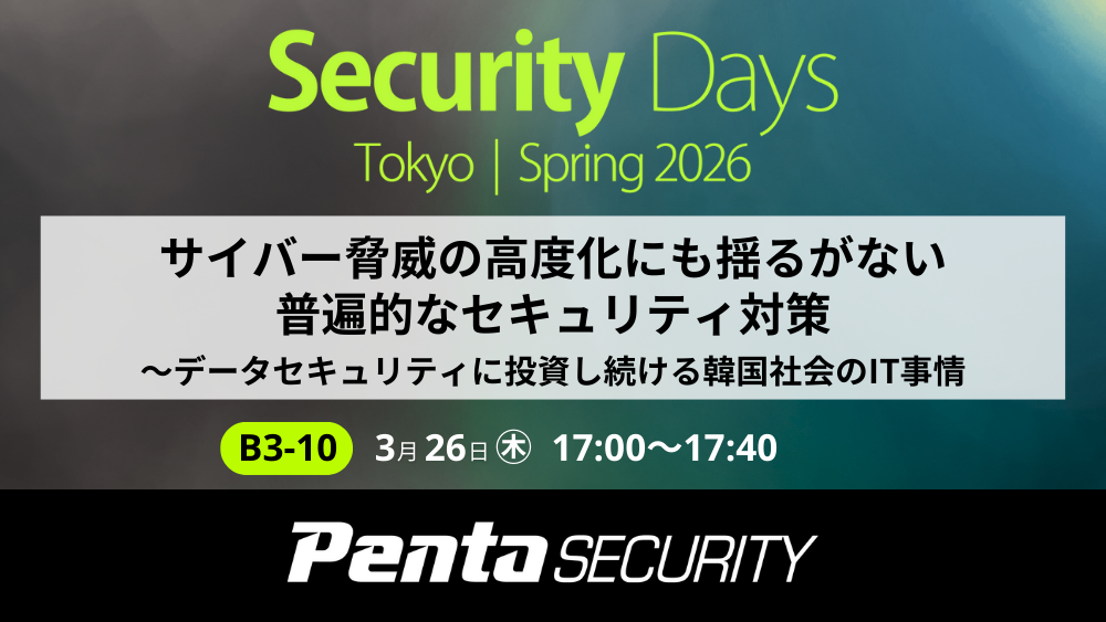 情報セキュリティ企業のペンタセキュリティ株式会社(本社:韓国ソウル、日本法人 代表取締役社長:陳 貞喜、以下ペンタセキュリティ)は、2026年3月26日(木)にJPタワー ホール&カンファレンス(KITTE 4F)で開催されるイベント「Security Days Spring 2026 Tokyo」にて、講演することをお知らせいたします。