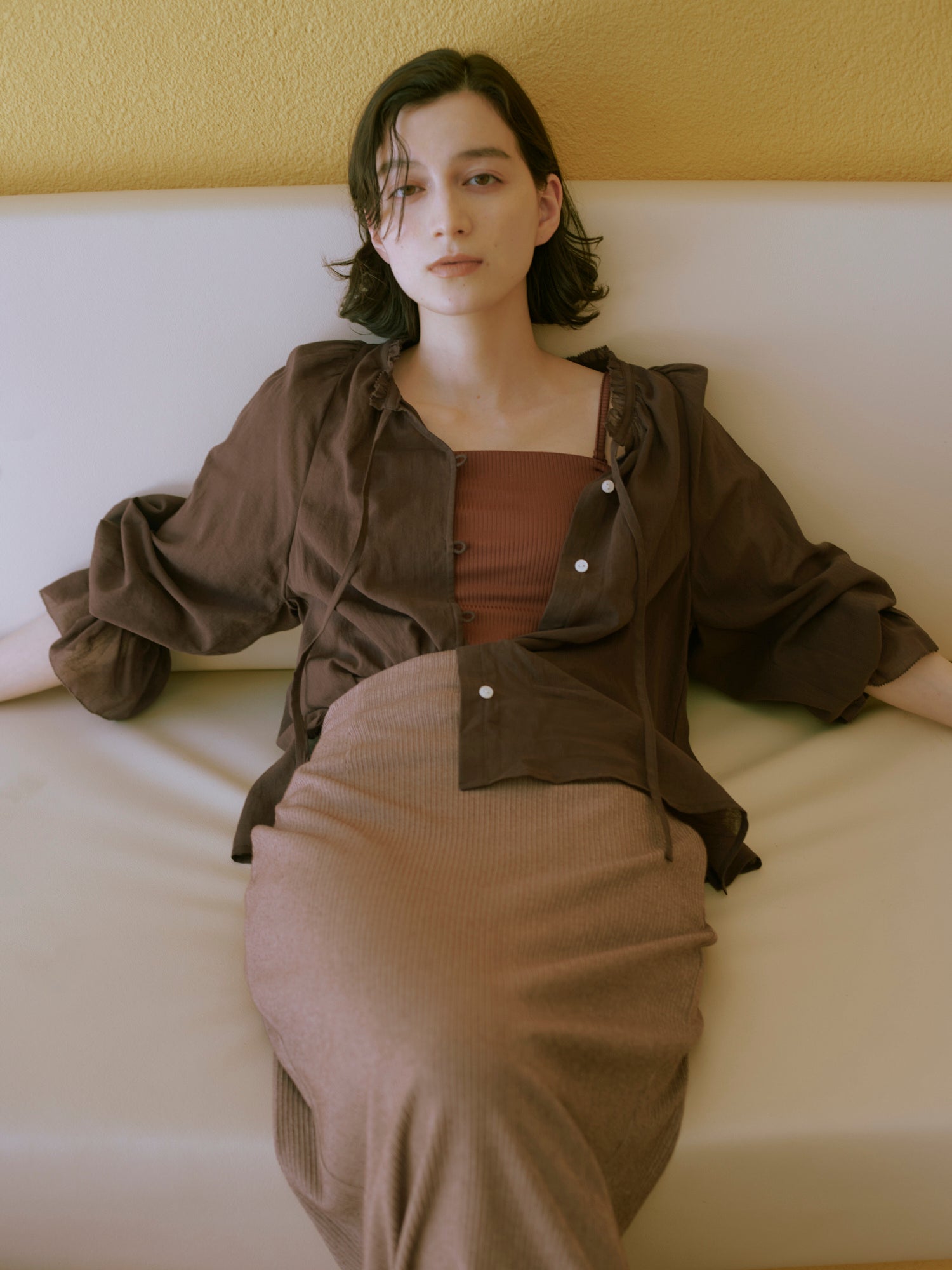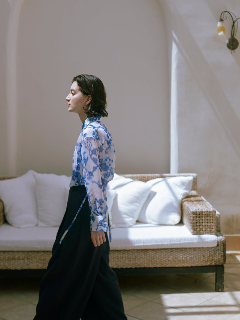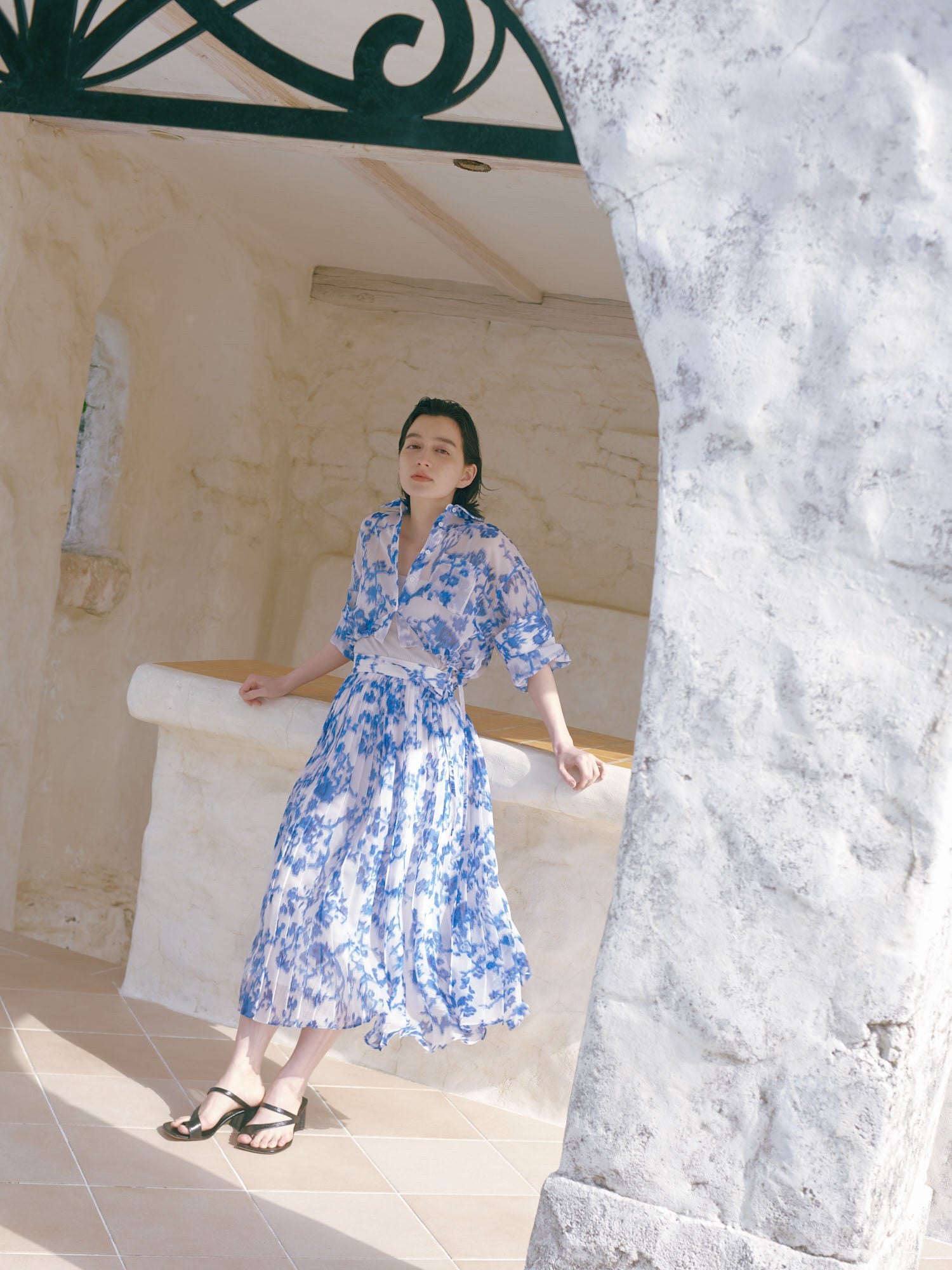 シアー感のあるオリジナル柄のセットアップは注目のアイテム。そのほかも、一枚でコーディネートが仕上がるリラクシーなワンピースや、小さく小さく波打つような表面感のある生地を用いたボトムスなど、凛とした姿と余裕が感じられるアイテムを取り揃えました。