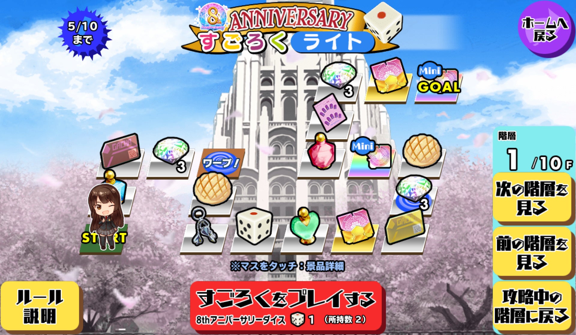 「8thアニバーサリーダイス」を使って様々なアイテムがゲットできる《8thアニバーサリーすごろくライト》開催!全10階層となっており、各階層のゴール報酬では『EXRミニ限突回路』や『10連レアガチャ券』などが確実に手に入る!
