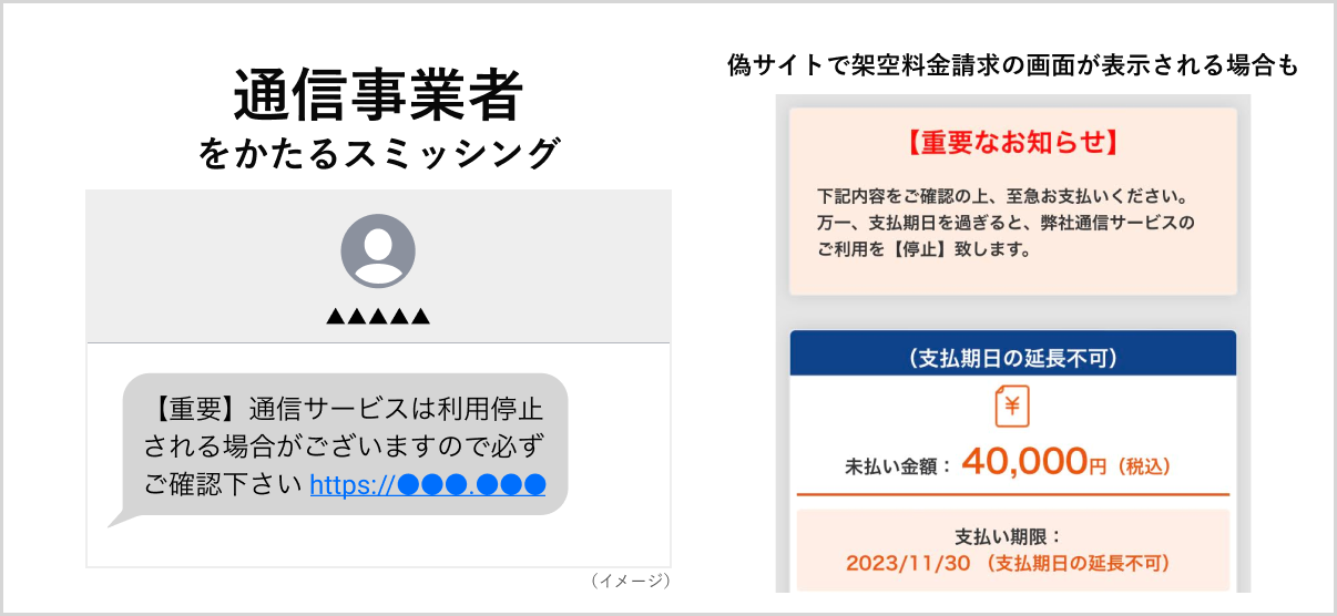 未納料金やアカウント不正利用など緊急を装って文面のURLをクリックさせ、フィッシングサイトに誘導します。偽サイトで個人情報を盗み取るほか、通信事業者が提供するセキュリティアプリに似せた偽アプリ(マルウェア)をインストールさせ、感染した端末を踏み台に詐欺SMSを大量送信させる「ばらまき型」も多発しています。また、未納料金に関する偽サイトに誘導し、プリペイドカード等で支払わせる「架空料金請求型」の手口も発生しています。