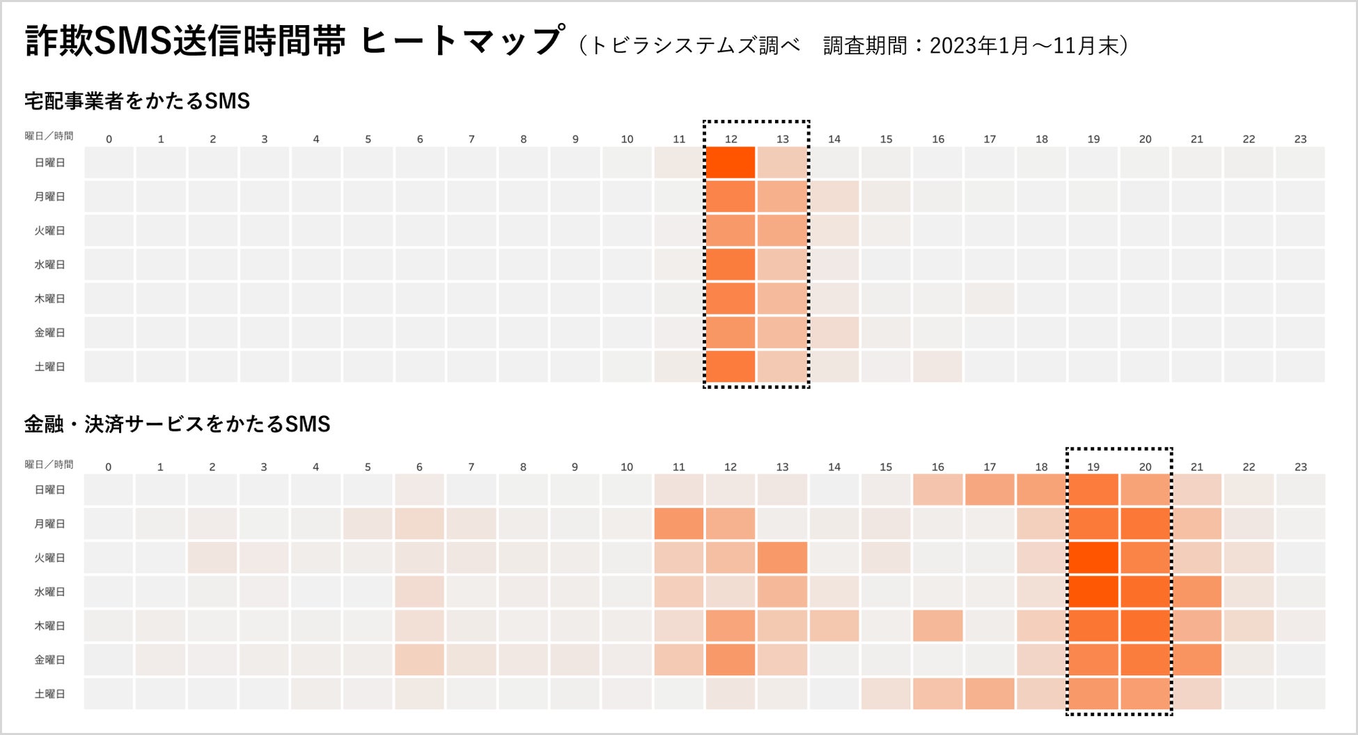 1位の宅配事業者をかたるSMSと、2位の金融・決済サービスをかたるSMSが送信される曜日・時間帯をヒートマップにして比較しました。