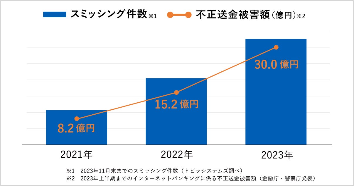 トビラシステムズの調査で、2023年1月〜11月に確認されたスミッシングの件数は、前年同期比で1.8倍に増加しています。また、警察庁と金融庁が発表したフィッシングによるものとみられるインターネットバンキングに係る不正送金被害額は、2023年上半期において30億円に上っています(※)。