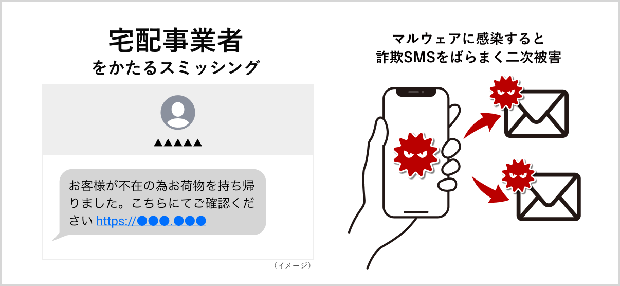 詐欺SMSに添付されたURLから偽アプリのインストールに誘導し、被害者の端末をマルウェア(不正なソフトウェア)に感染させ踏み台にすることで、大量の詐欺SMSを送信するよう仕向ける「ばらまき型」の手口も目立っています。