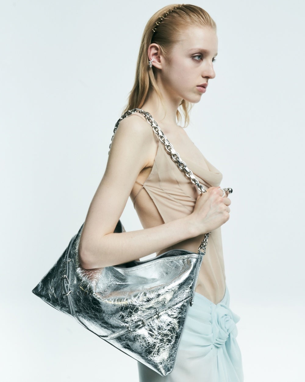 ジュエリーようなメタル・リンクの特徴的なダブルチェーンストラップは、長いシングルストラップへと優雅に変化させることで、シーンに応じて肩掛け、クロスボディといった使い分けを可能にします。サイズはミディアムのみの展開で、タンブルレザーのクラシックなブラックとアイボリー、ラミネートレザーのシルバーグレー、ウォッシュドデニムのミディアムブルーなど、多彩なカラーバリエーションが揃います。ゆったりとしたメインコンパートメントの内側には、鍵やウォレットなどのエッセンシャルアイテムの収納に最適なジップポケットが付いています。外側には「V」ラインのコーナーストラップがあり、荷物のボリュームに合わせて調節が可能です。フロントにさりげなくエンボスされた「GIVENCHY」のシグネチャーが、今どきのファッション・ステートメントを完成させています。