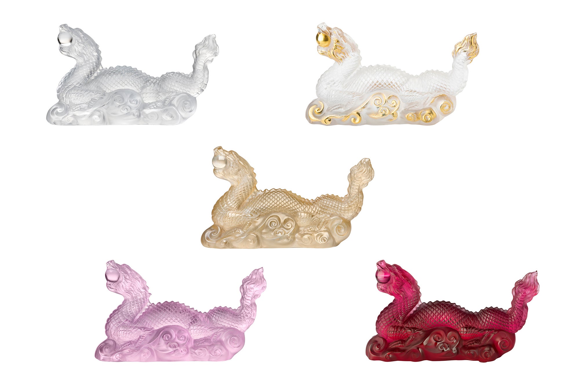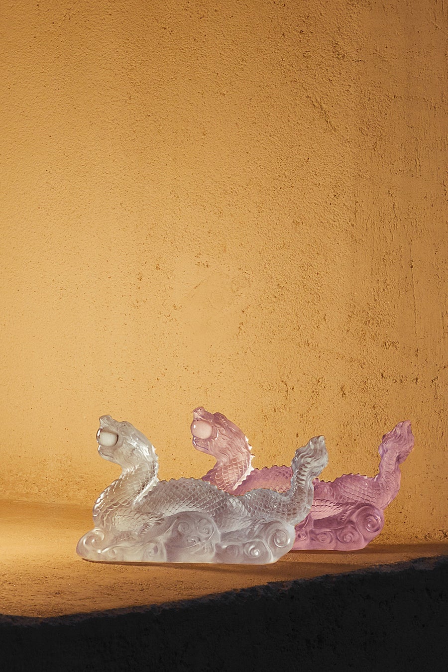 天空を泳ぐムーブメントが軽やかな《ドラゴン ティエンロン》オブジェ。クリスタルに刻まれた精緻な龍のディテールが凛としたオーラをまとわせます。カラーバリエーションは5色を展開。世界限定188点の「ピンク」は、希少かつ高価な金属である酸化エルビウムを組成に含みます。