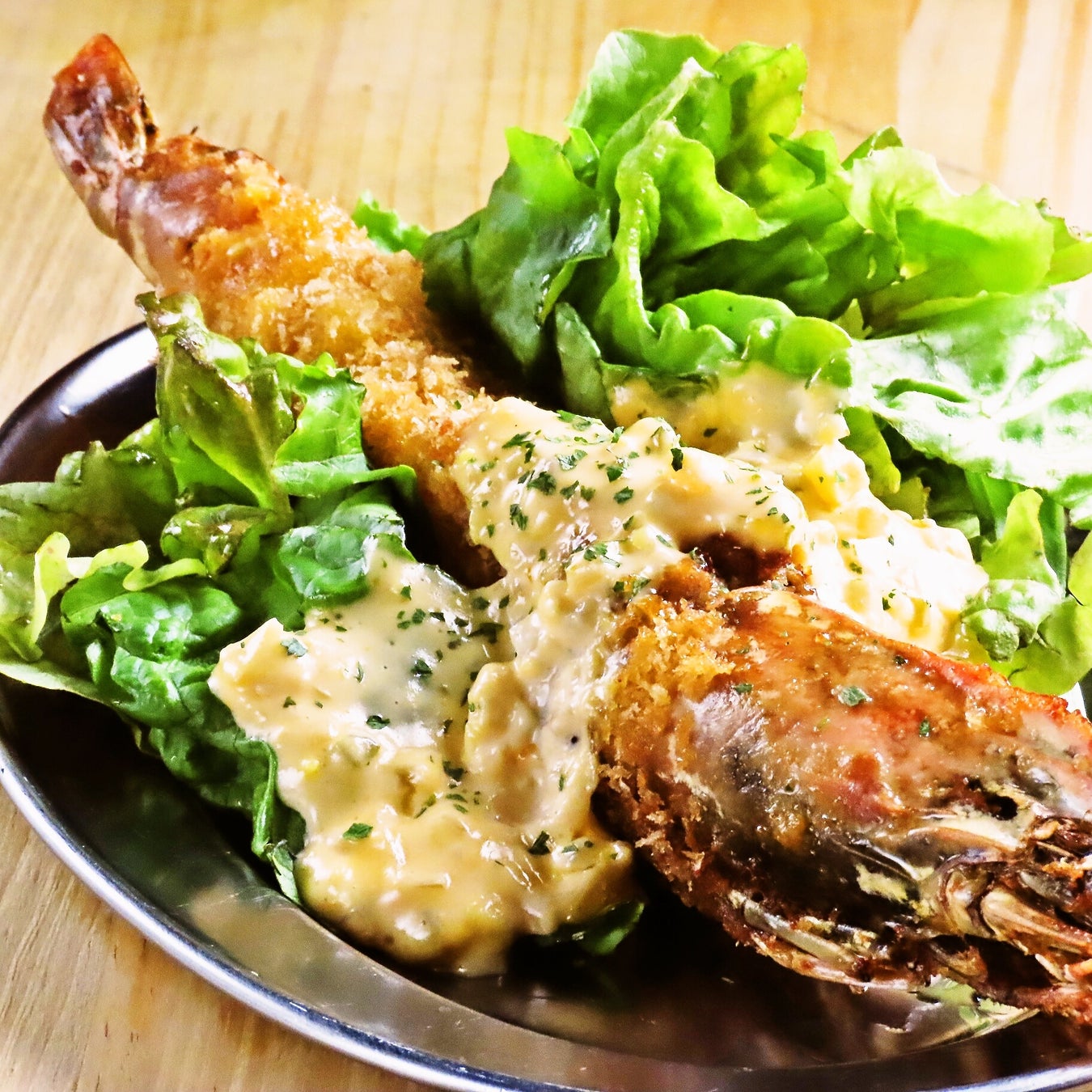 名古屋の名物ジャンボエビフライをサクサクに仕上げました。タルタルソースとの相性も絶妙。549円(税込)。