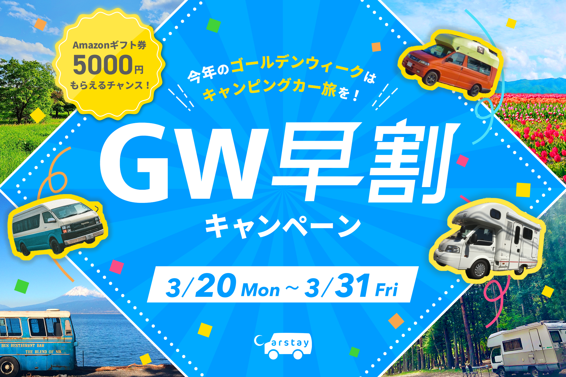 国内最大級のキャンピングカーレンタル・カーシェアと車中泊スポットの予約など「バンライフ※」のプラットフォーム事業を展開するCarstay(カーステイ)株式会社(本社:神奈川県横浜市、代表取締役:宮下晃樹)は本日から、ゴールデンウィーク(4月29日(土)~5月7日(日))期間中のキャンピングカー予約・利用者を対象に、5,000円分のAmazonギフト券をプレゼントする『Carstayゴールデンウィーク早割キャンペーン2023』を開始しました。