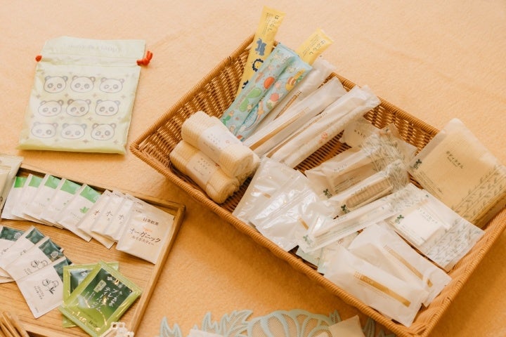 <フロント>歯ブラシ・ボディタオル・カミソリ・ブラシ・コットンセット・ヘアゴム