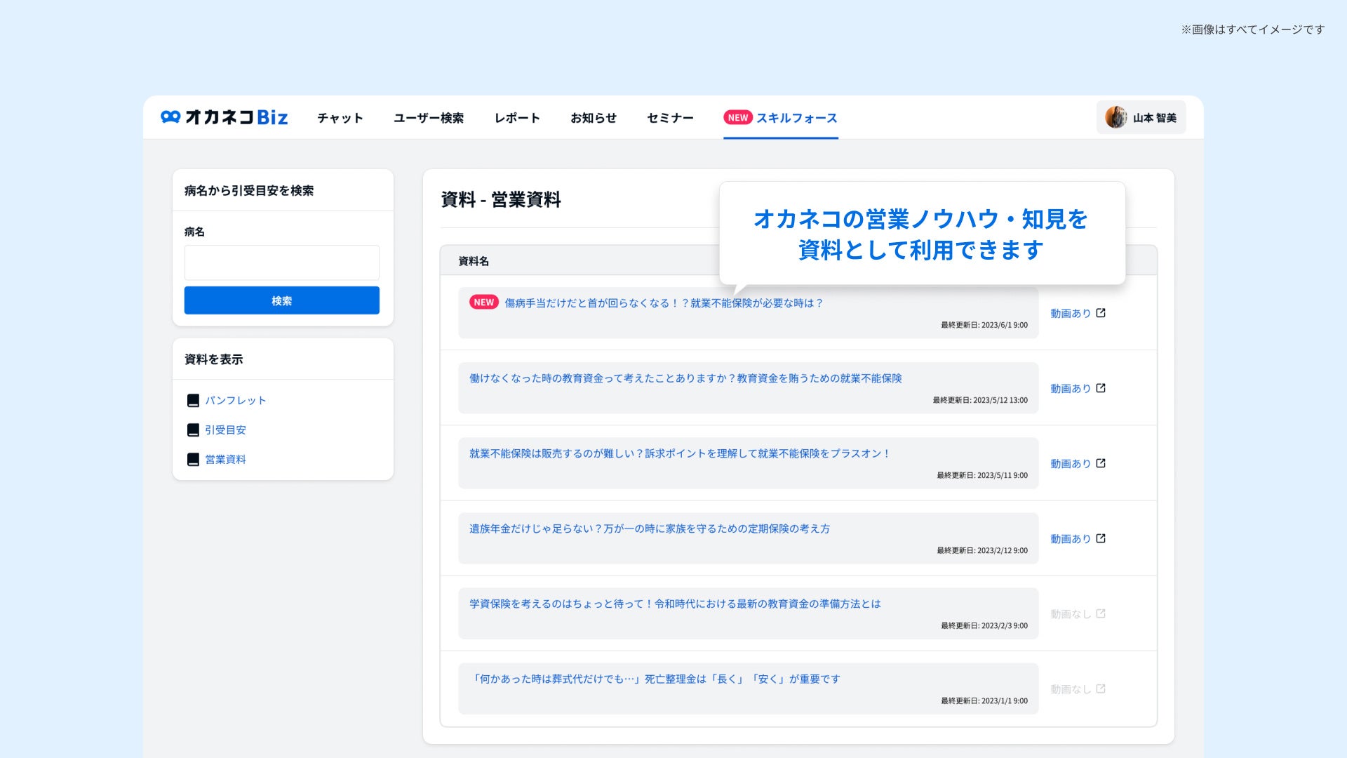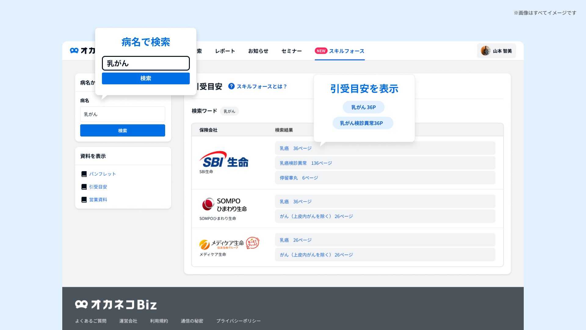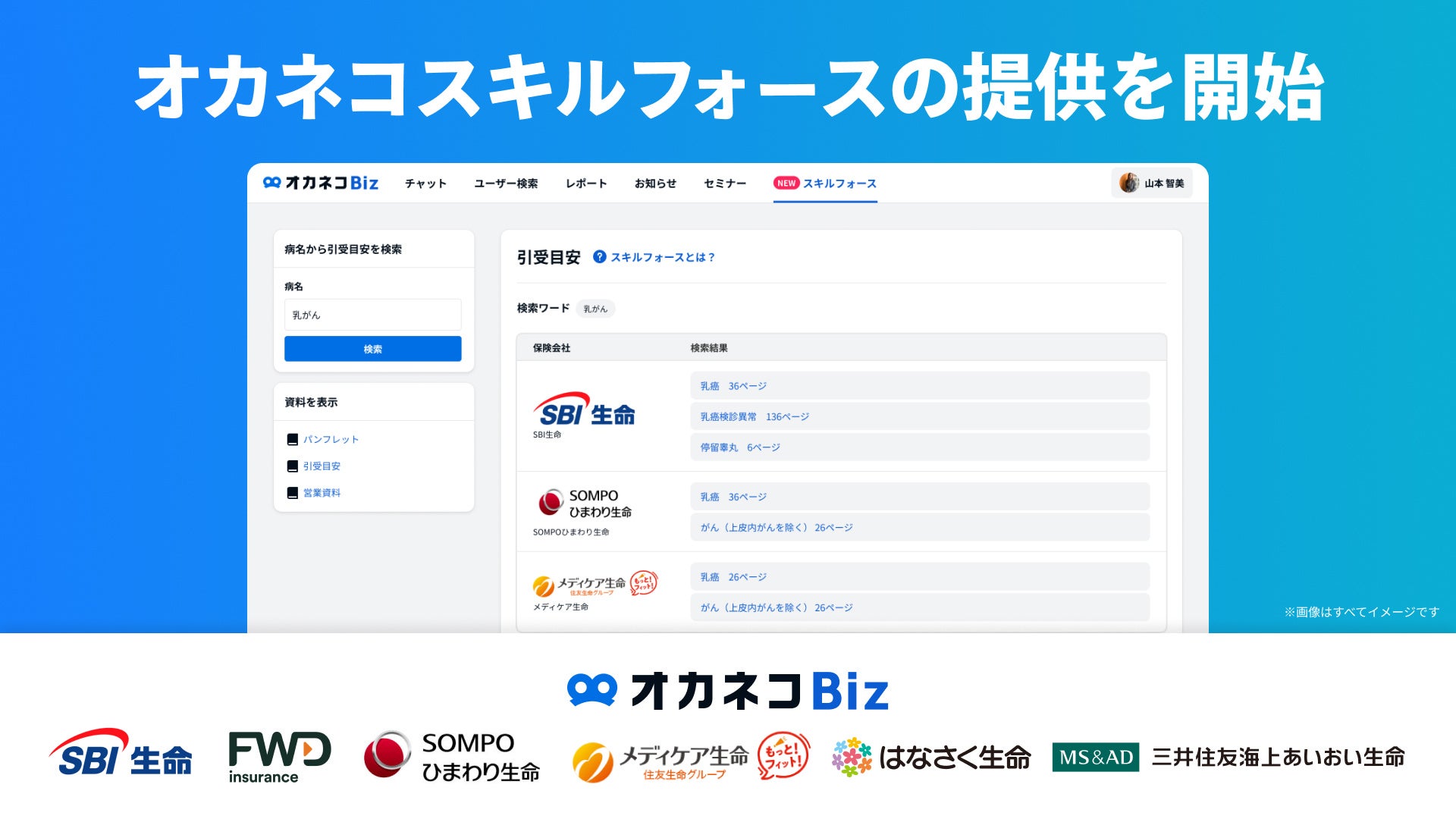 そしてこの度、「オカネコスキルフォース」は、金融商品の販売に関わる保険代理店、IFAの方の営業生産性の向上を目的としたサポート機能を取り揃えたプロダクトとしてリリースしました。第一弾としては、「保険商品毎に設けられる疾病等による医務引受の基準検索機能」と、当社が実際に販売を行って得たノウハウを元に形成された「販売手法に関するコンテンツ閲覧機能」の提供を開始します。