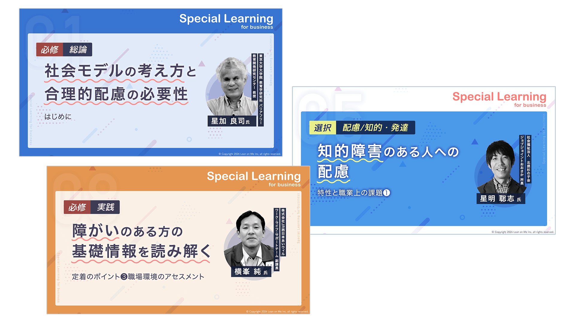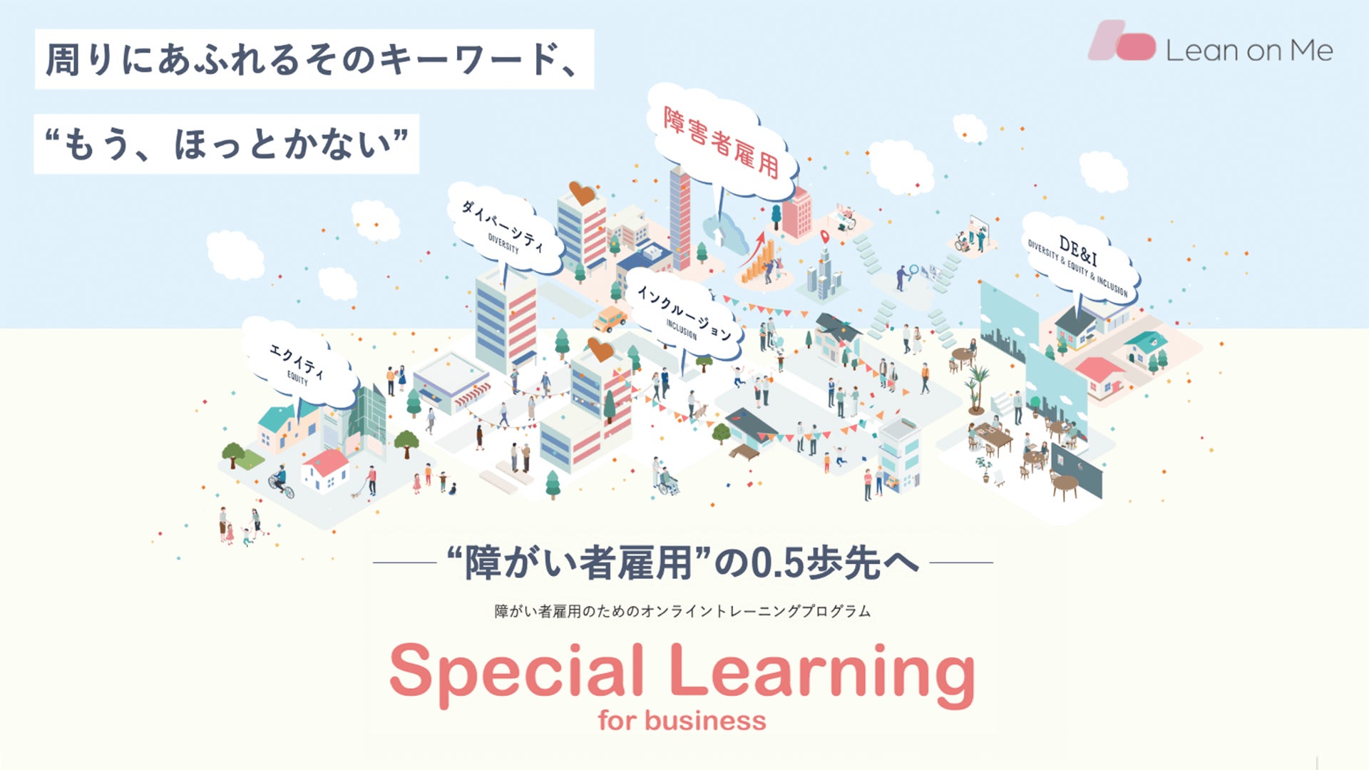株式会社Lean on Me(本社:大阪府高槻市、代表取締役:志村駿介、以下「リーンオンミー」)は2024年5月27日、障がい者雇用に取り組む企業向けのeラーニング〈Special Learning for business〉を開始いたしました。民間企業の法定雇用率は同年4月に2.5%へ引き上げられましたが、採用や定着は一朝一夕でいかないのが現状です。当サービスでは「そもそも障がいとは何か」といった総論から、現場で活かせる実践法まで幅広く紹介。豊富な講師陣によるコンテンツを提供し、企業のDE&Iを後押しします。