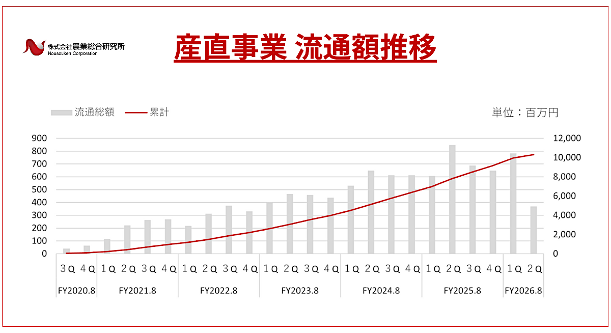 「持続可能な農産業を実現し、生活者を豊かにする」をビジョンに掲げ、全国の都市部を中心としたスーパーマーケットで「農家の直売所」を運営する株式会社農業総合研究所(本社:和歌山県和歌山市、代表取締役会長CEO:及川 智正、以下「当社」)は、産直事業の流通総額が累計で100億円(10,315百万円)を突破したことをご報告いたします。