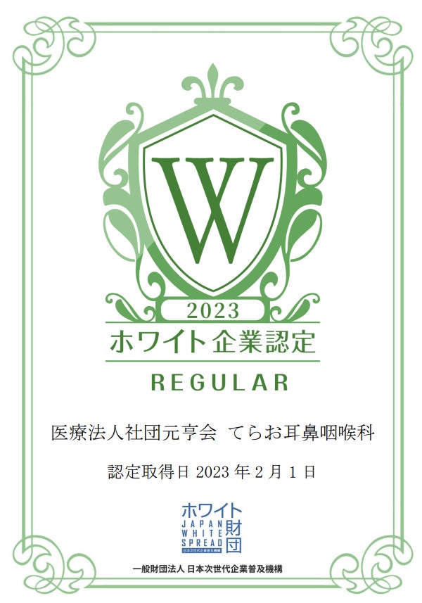 医療法人社団元亨会 てらお耳鼻咽喉科が、一般財団法人日本次世代企業普及機構(通称:ホワイト財団)が運営する「ホワイト企業認定 レギュラー」を取得しましたことをお知らせいたします。