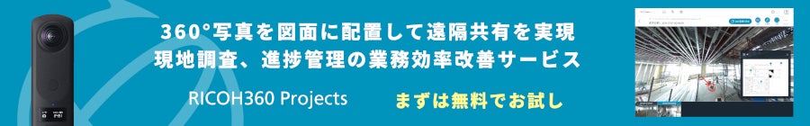 「RICOH360 Projects」は、建設現場の状況をRICOH THETAの360°画像でもれなく撮影、整理、共有することで、コミュニケーションと働き方を変えていくクラウドサービスです。 遠隔の現場に行かなくても、360°画像で現場の様子を抜け漏れなく確認・把握できます。