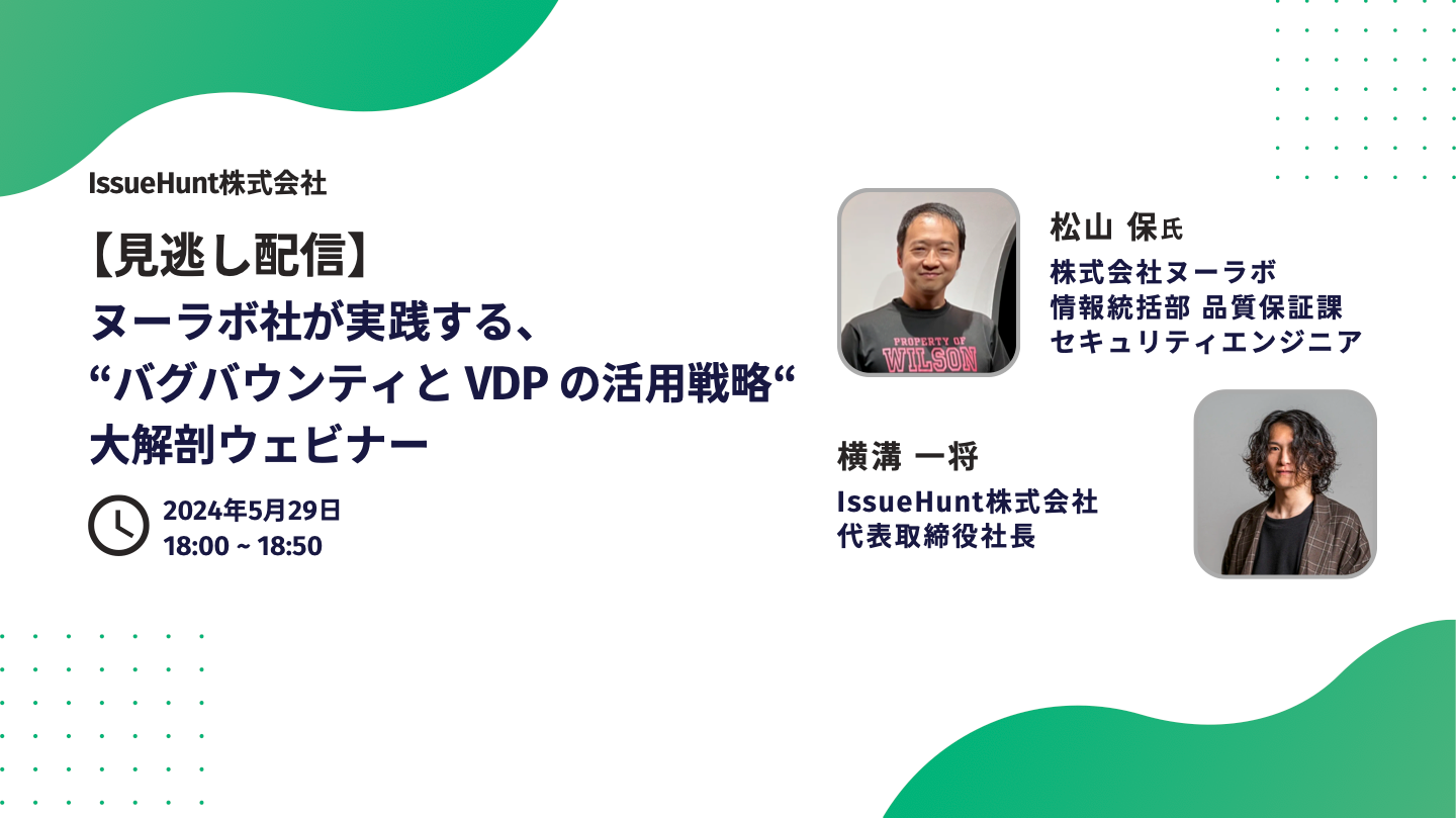 IssueHunt株式会社、「ヌーラボ社が実践する、バグバウンティとVDP(脆弱性開示プログラム)の活用戦略 大解剖ウェビナー」の見逃し配信を5月29日に開催決定