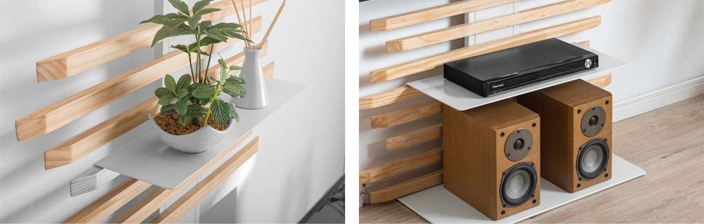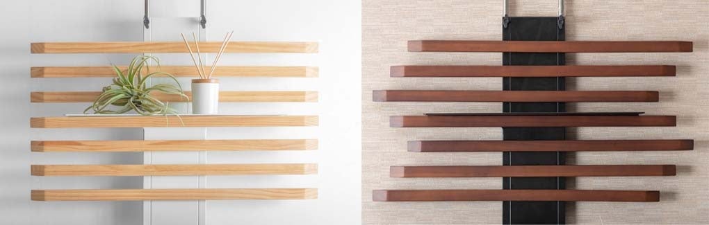 無垢材はそれぞれ左右に3段階で配置が可能となっており、自分好みのデザインで壁面を飾ることができます。つっぱり式のためテレビ上部の壁面までもが無垢材で彩られ、お部屋に新しい表情を生み出します。