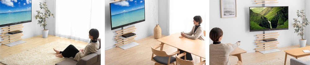 また、左右の首振り機能は片手で簡単に調節ができるようになっており、ソファからダイニングの移動など生活の導線に合わせて即座に角度を変え快適な視聴環境を実現します。