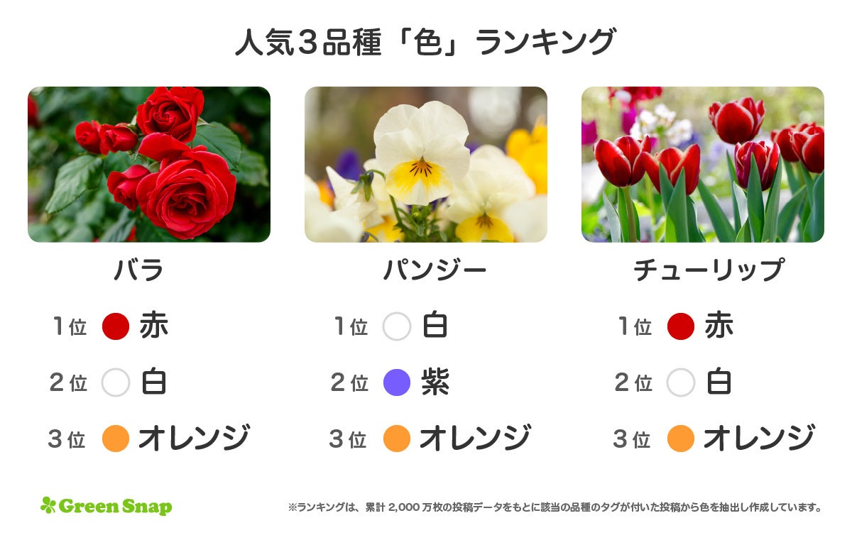 植物に特化したビックデータプロジェクト「PlantsDATA」では、2,000万枚の植物写真をもとに植物のトレンドなどを分析しています。 今回、人気の品種である「バラ」「パンジー」「チューリップ」の3品種について、ユーザーから投稿された写真の花の色を抽出し、多い順に並べたランキングを作成しました。