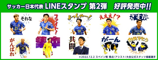 「サッカー日本代表公式スタンプ第2弾」は、昨年末にカタールで開催された国際大会に向けて招集されたSAMURAI BLUE(日本代表)の全26選手、サッカー日本代表の公式マスコットのカラッペ・カララに加えて、森保一監督も登場する全32種のスタンプです。