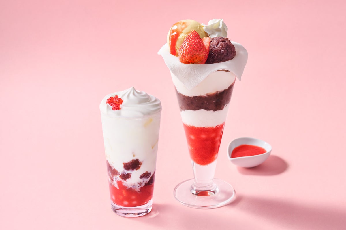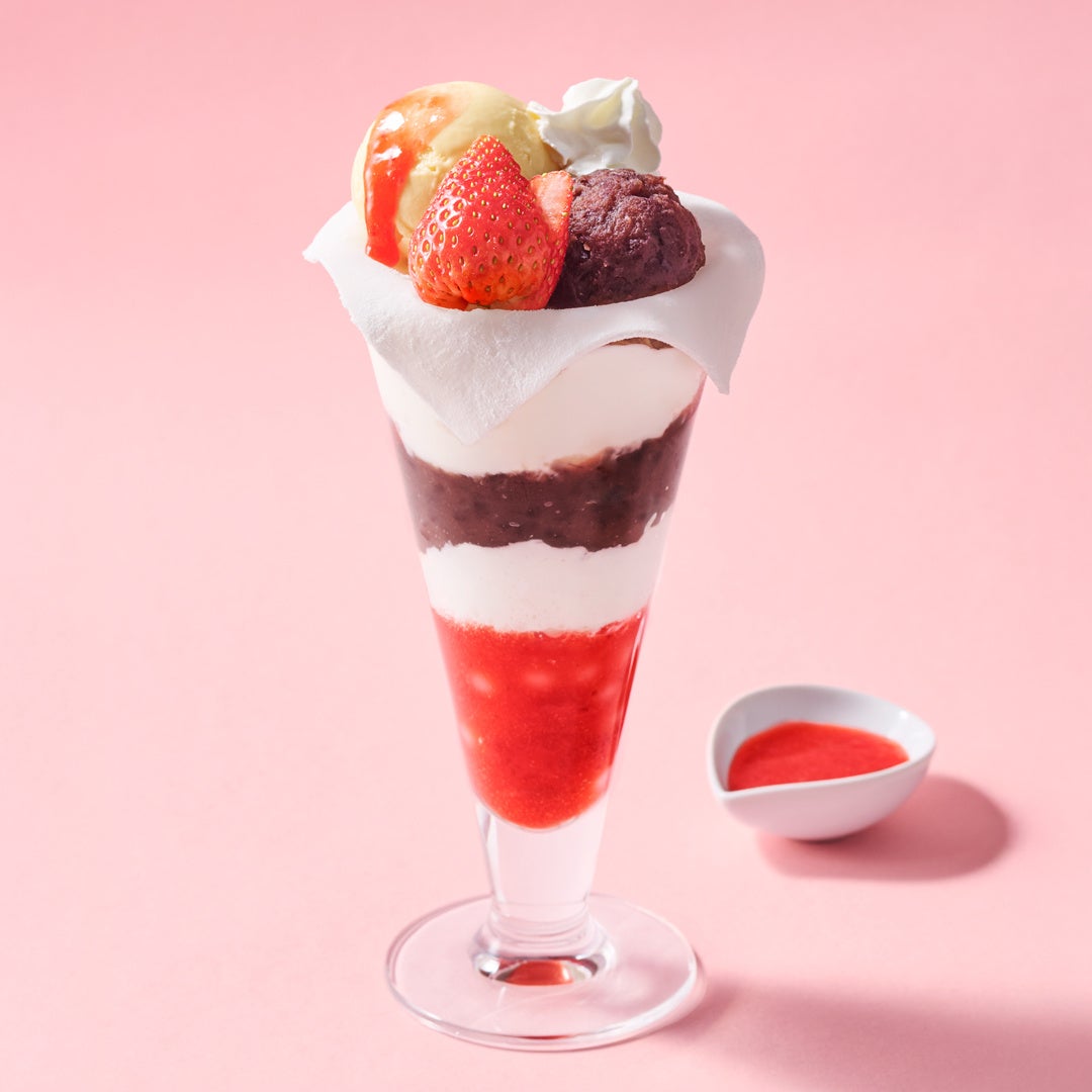 【nana's green tea】まるで苺大福! 求肥・苺・あずきで苺大福をパフェに再現。苺大福をモチーフとしたデザートドリンクも登場。 4/8〜