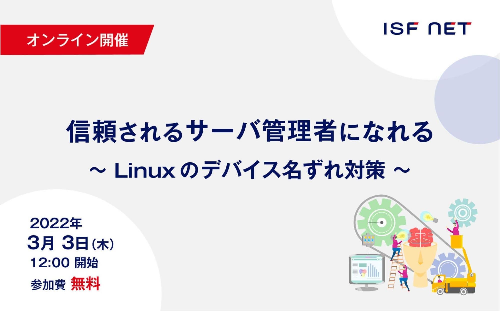 ITインフラソリューションを中心に、クラウド環境や、ネットワークシステムの構築・保守・運用におけるサービスを提供する、株式会社アイエスエフネット(本社:東京都港区、代表取締役:渡邉幸義、社員数:2,328名)は、2022年3月3日(木)に無料オンラインセミナー「信頼されるサーバ管理者になれる~Linuxのデバイス名ずれ対策~」を開催いたします。