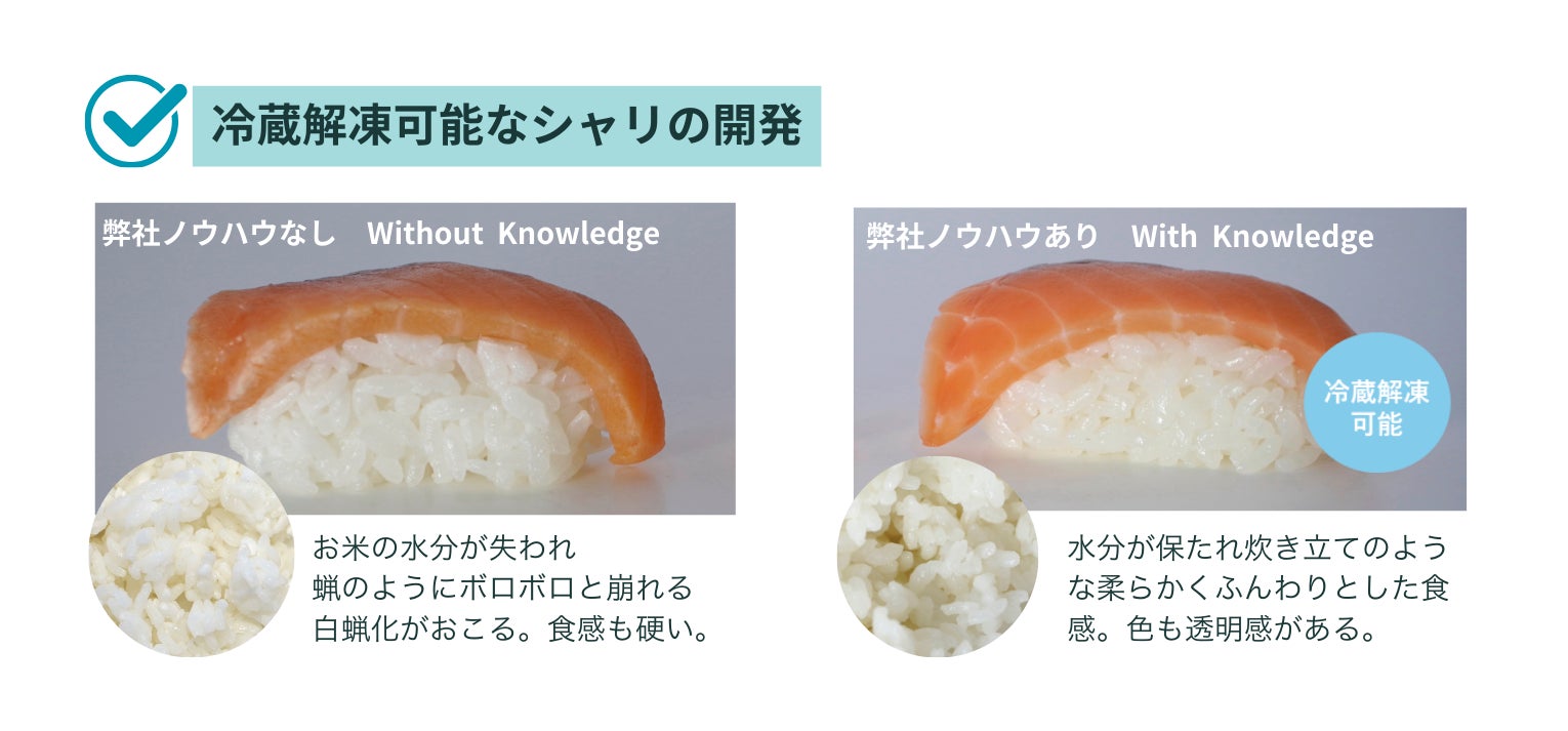 シャリのレシピ開発により、寿司の解凍方法として最も難しく、従来の出来ないとされていた冷蔵解凍を実現しました。オペレーションの負担や衛生的な視点で冷蔵解凍が求められることが比較的多いホテルなどでは、解凍方法がボトルネックになり、冷凍を活用したくても活用できない現場がありました。冷蔵解凍と高品質をかね揃える本商品は、宴会や朝食バイキング、イベントなどあらゆる用途で活用できます。