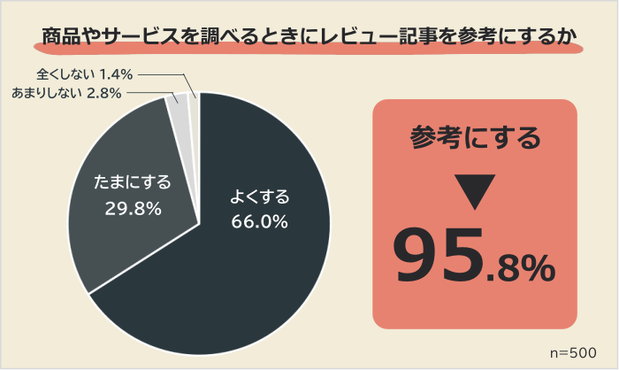 株式会社マイスタースタジオの調査によると、商品やサービスを調べる際にレビュー記事を参考にする人は全体の95.8%にものぼり、多くの人が口コミなどのレビューを参考にしていることがわかります。