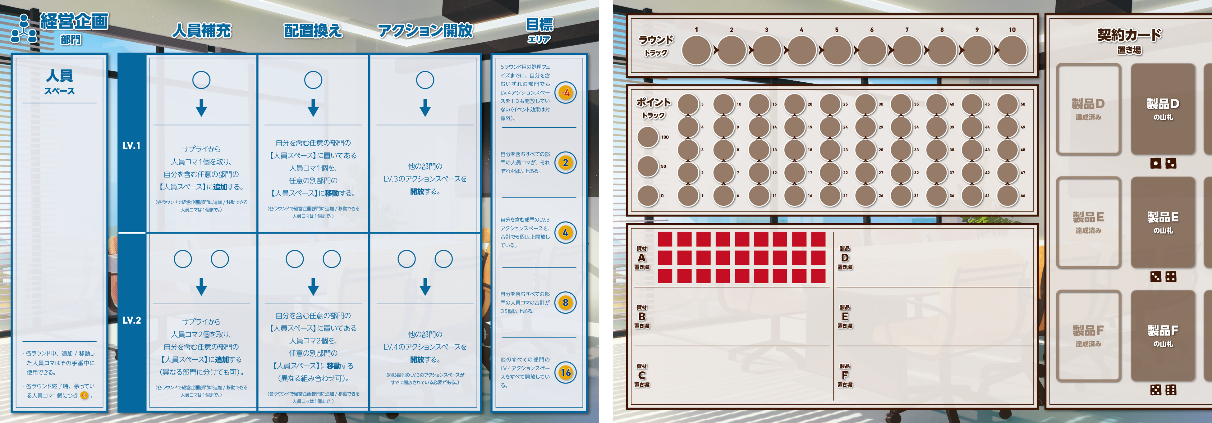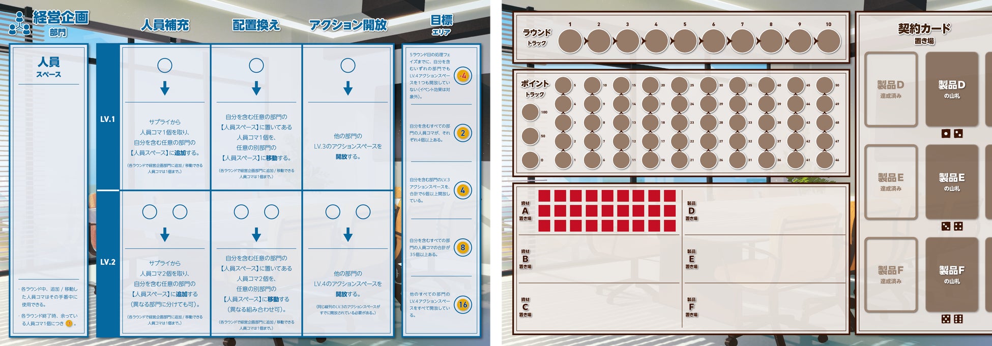 各部門にはそれぞれ異なる目標が設定されています。また、突発的な需要変動や供給トラブルなどのイベントも発生します。プレイヤーは自部門の成果を最大化しながらも、発生するイベントに対処しつつチーム全体としてのスコア最大化を目指さなければなりません。