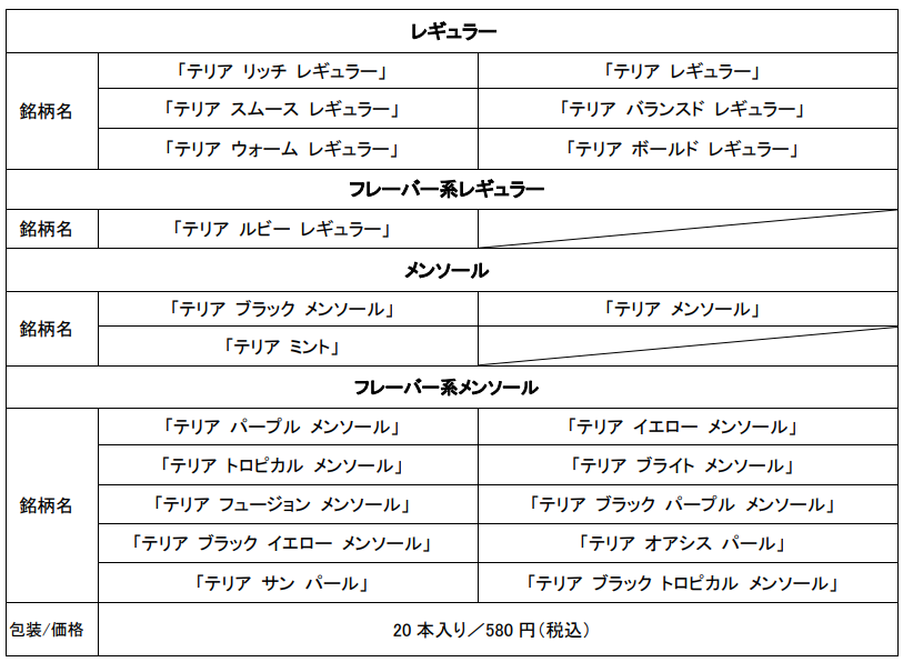 今回の「テリア ブラック ルビー メンソール」の発売に伴い、テリア製品のラインアップは全21銘柄となります。