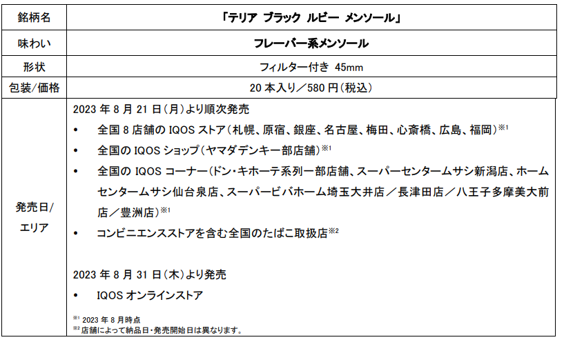 フィリップ モリス ジャパン合同会社(本社:東京都千代田区、社長:シェリー・ゴー、以下「PMJ」)は、加熱式たばこ IQOS ILUMA(イルマ)専用たばこスティック「TEREA(テリア)」から、「テリア ブラック ルビー メンソール」を、2023年8月21日(月)より、全国8店舗のIQOSストア※、IQOSショップ(ヤマダデンキ一部店舗)、IQOSコーナー(ドン・キホーテ系列一部店舗他)、コンビニエンスストアを含む全国のたばこ取扱店で、2023年8月31日(木)よりIQOSオンラインストアにて順次発売いたします。