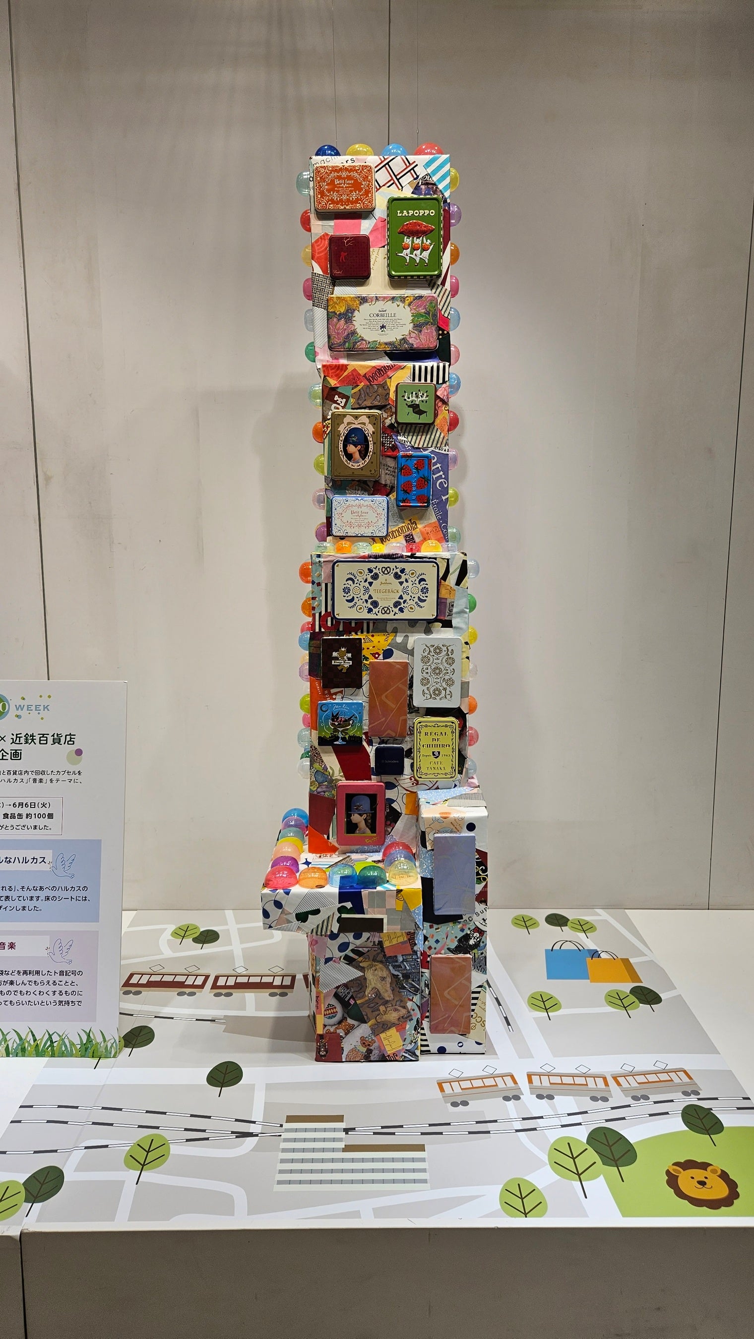 今回は、そこでお客さまから回収した紙袋約750枚、お菓子の空き缶約100個と百貨店の売場で不要となったガチャガチャカプセル約50個をアップサイクルします。不用品を使用して、「自然」「音楽」「関西」「ハルカス」をテーマにしたオブジェを制作いたしました。