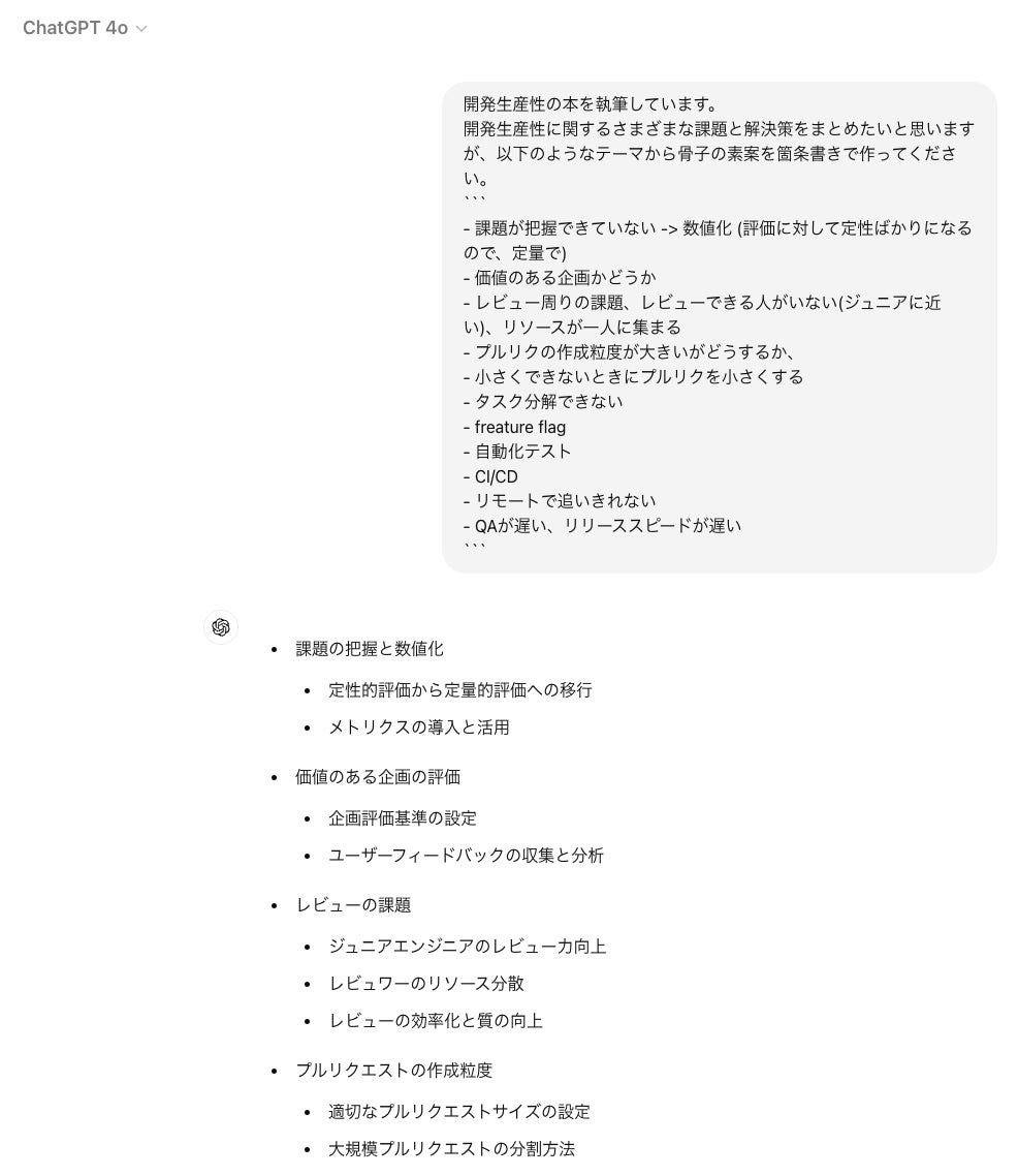 著者の佐藤は自社の事例や自身の開発生産性に対する考えをベースにしながら、3種の生成AI「ChatGPT 4」「Claude」「GitHub Copilot」を活用して本書の執筆を進めました。全体の構成については自身の考えをベースにChatGPTを通して骨子を作成し、Claudeのアウトプット情報と比較しながらGitHub Copilotを使って原稿の執筆スピードを高めてきました。その他にも原稿のレビュー過程で文章の校閲を一部で実施するなどして、生成AIによる「執筆生産性」の大幅改善も果たしています。