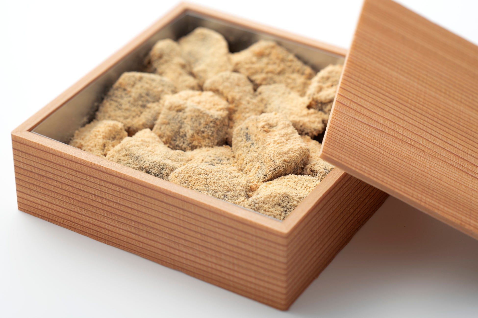 国産の本蕨粉100%と砂糖のみを使用した、素材の上質な味わいそのままを活かしたやわらかで粘り強いわらび餅。国産特上きな粉をたっぷりとかけて仕上げました。