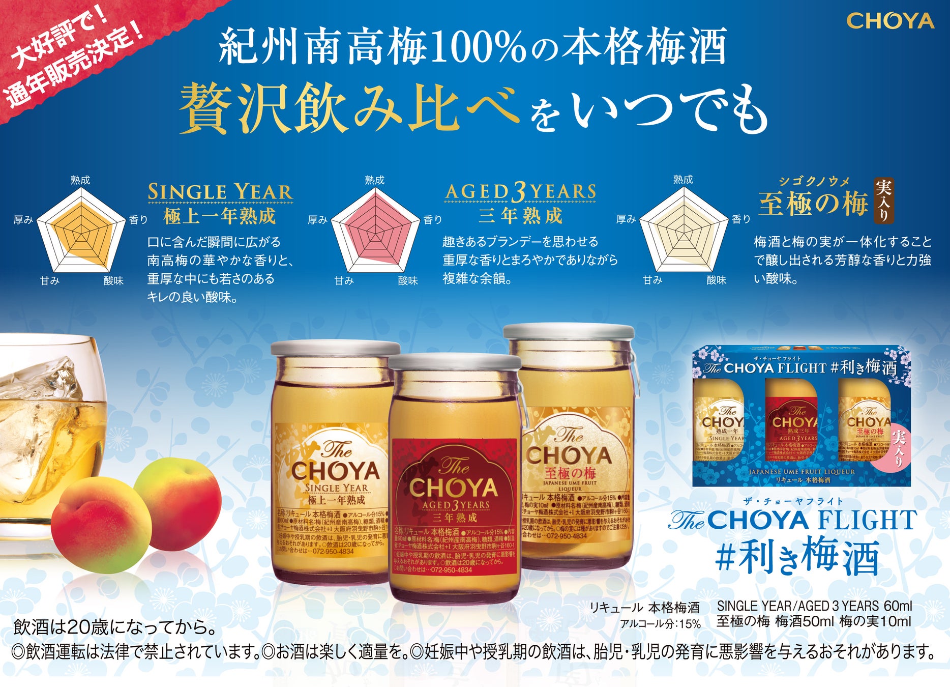 ”FLIGHT(フライト)”には「数種類の試飲セット」という意味があり、梅酒カクテル専門店「The CHOYA 銀座BAR」の人気メニュー「The CHOYA FLIGHT」を商品名にしました。