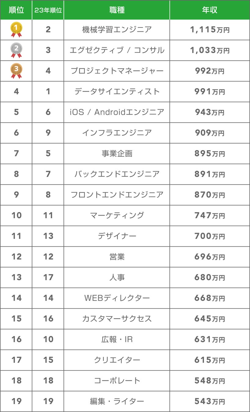 ・10位以内の非エンジニア職種は、「エグゼクティブ/コンサル、プロジェクトマネージャー、事業企画」と、戦略立案やプロジェクトマネジメント関連の3職種と「マーケティング」がランクイン