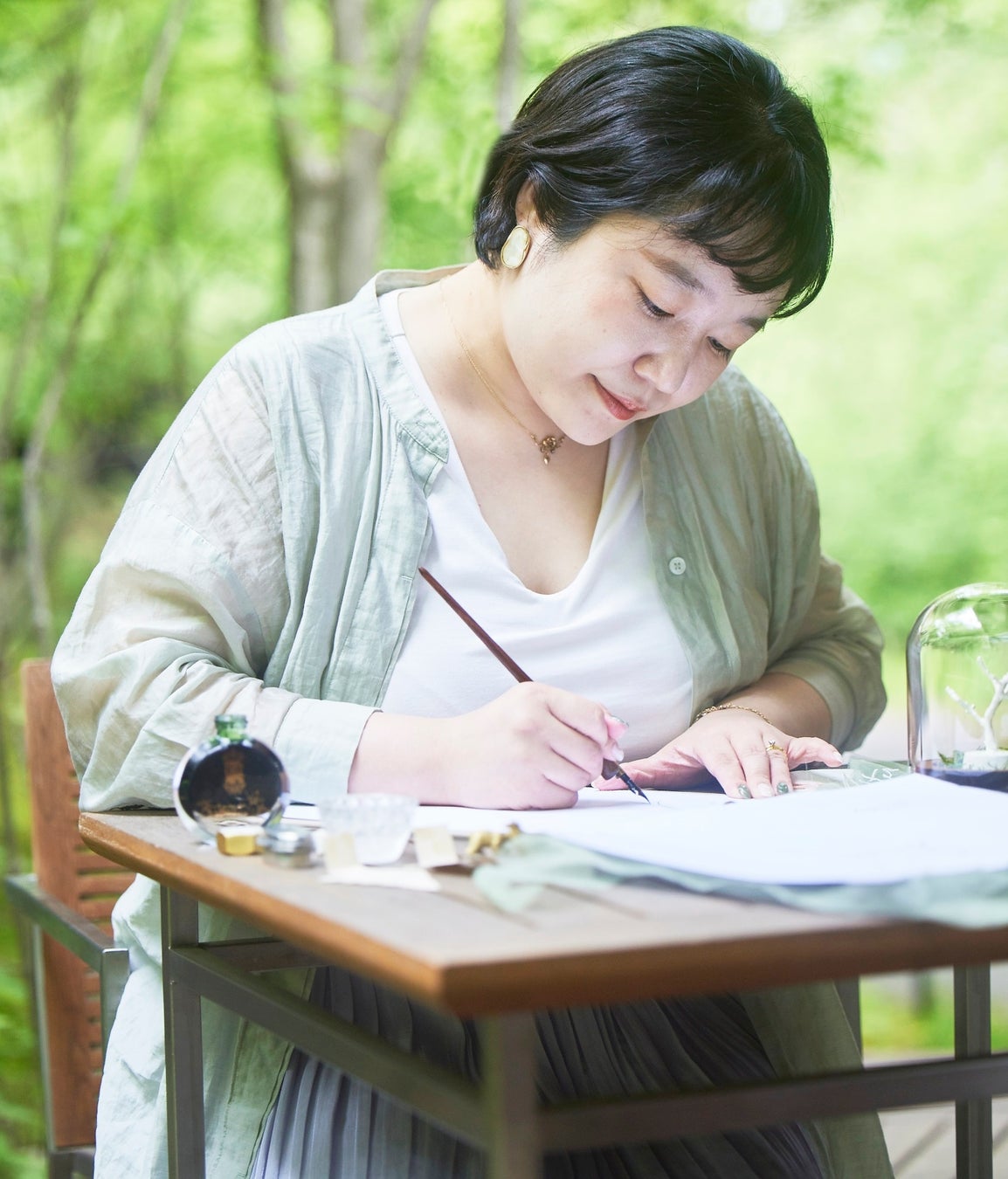 10歳の時アメリカでカリグラフィーと出会い、夢中になる。金沢美術工芸大学視覚デザイン科卒業後、百貨店のインハウスデザイナー/アートディレクターとして、手描き文字を生かした広告やロゴデザインの仕事に携わる。2021年に独立、企業のロゴデザイン/パーソナルな表札のデザイン/アーティストのツアーロゴ/カリグラフィーイベントでのライブ筆耕/ウェディングのペーパーアイテムデザイン制作が主なお仕事。近年では自身の海外生活の経験を生かした西洋と和モダンの融合、ポインテッドペンを使用した日本語を愉しむ「和モダンカリグラフィー」を得意とするカリグラフィーアーティストとしても活動中。