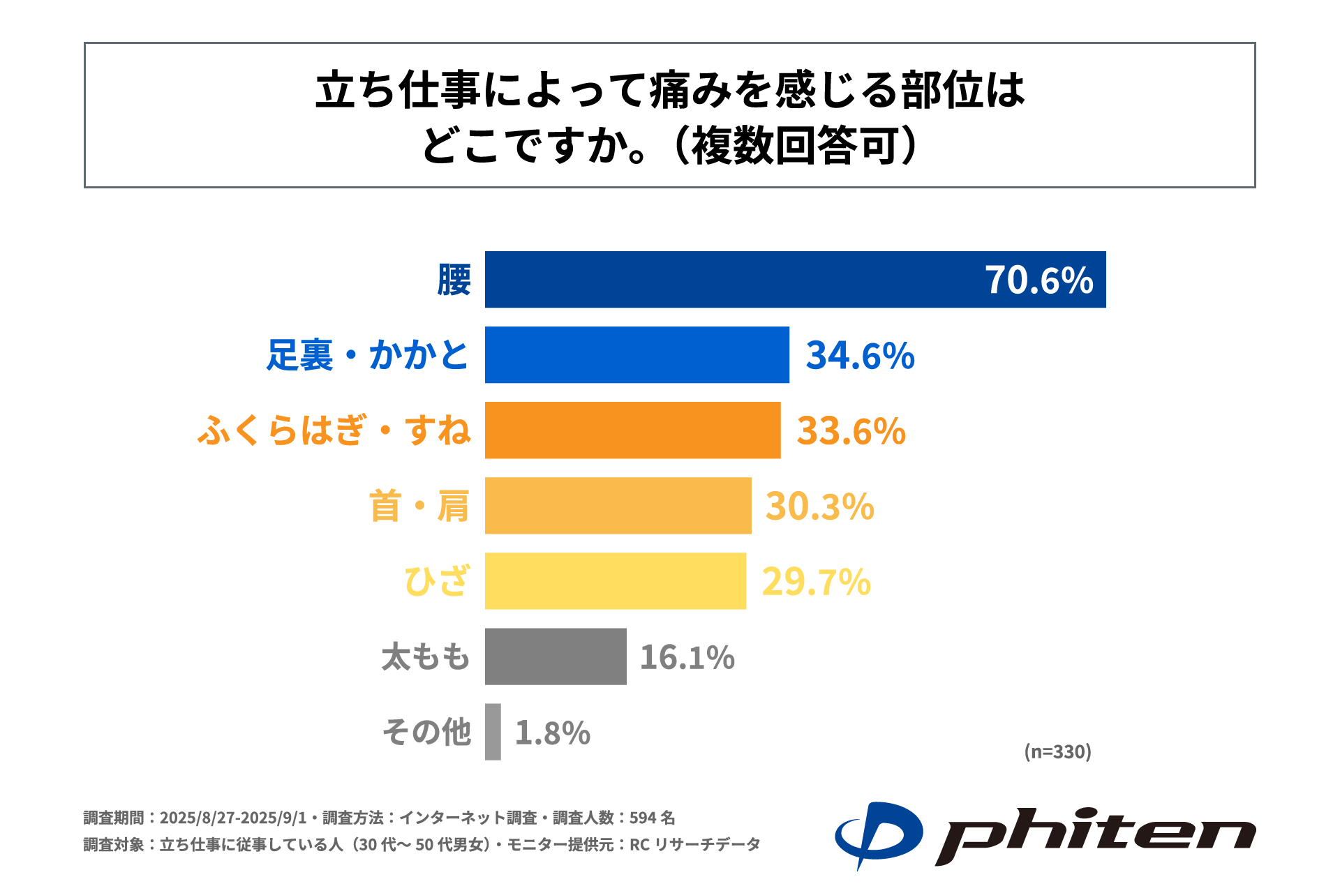 次に、立ち仕事が原因と考えられる身体の痛みを抱えていると回答した人を対象に「立ち仕事によって痛みを感じる部位」を尋ねる設問への回答では、1位が「腰」で70.6%、2位が「足裏・かかと」で34.6%、3位が「ふくらはぎ・すね」で33.6%という結果になりました。この結果から、立ち仕事によって最も多くの人が痛みを感じる部位は、「腰」であることがわかりました。