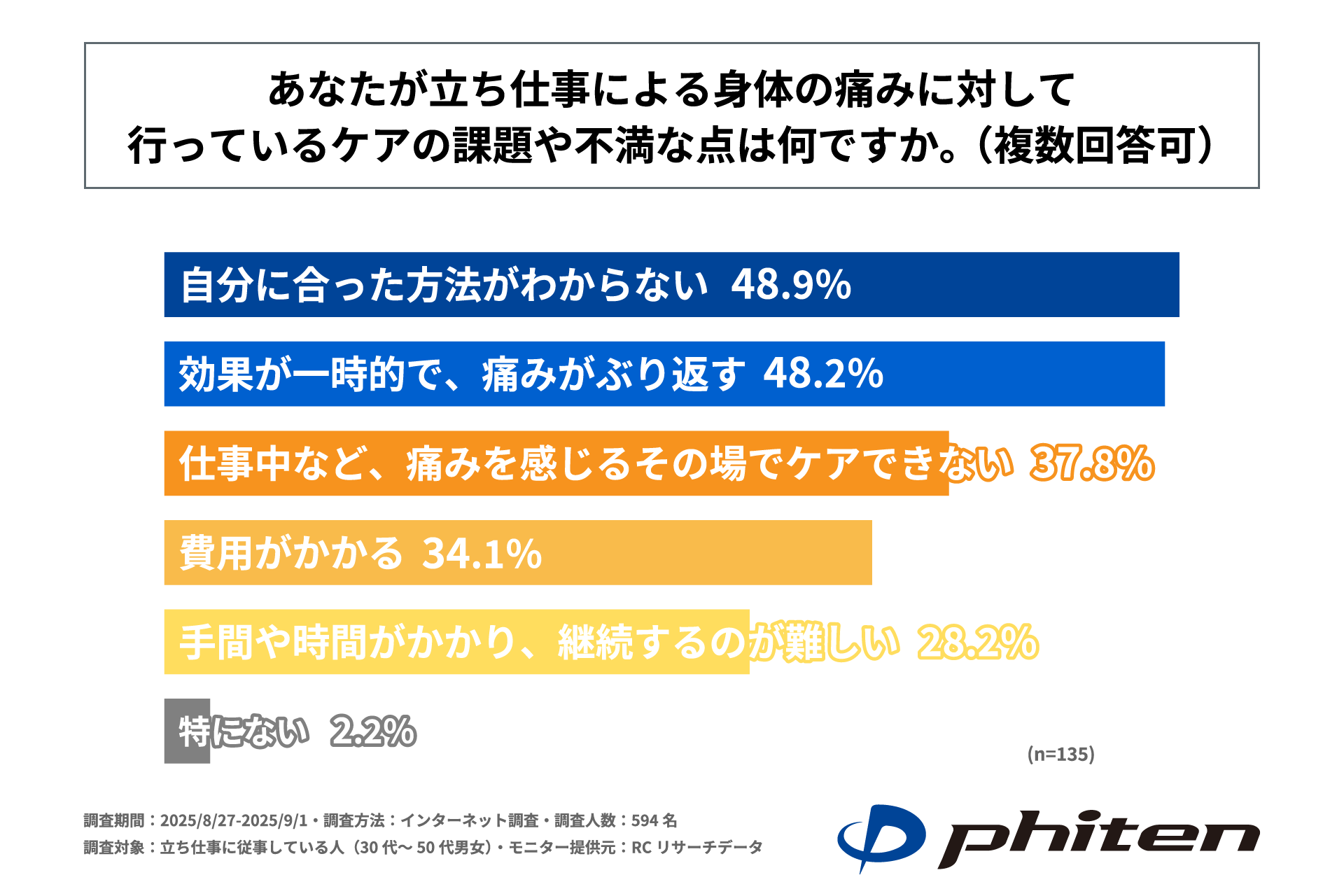 本調査の結果から、立ち仕事による身体の痛みに対して何らかのケアを行っている人のうち、4割以上の人がケアの効果をあまり感じられておらず、こうした人が抱えるケアの課題や不満な点は主に、「自分に合った方法がわからないこと」や「効果が一時的で、痛みがぶり返すこと」であることが明らかになりました。
