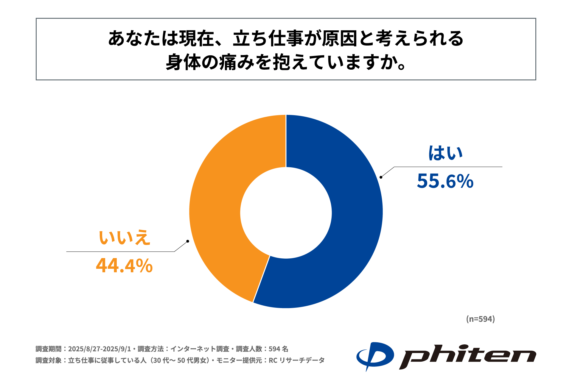 まず、「あなたは現在、立ち仕事が原因と考えられる身体の痛みを抱えているか」を尋ねる設問への回答では、「はい」が55.6%、「いいえ」が44.4%という結果になりました。この結果から、立ち仕事に従事している人の55%以上が、立ち仕事が原因と考えられる身体の痛みを抱えていることが明らかになりました。