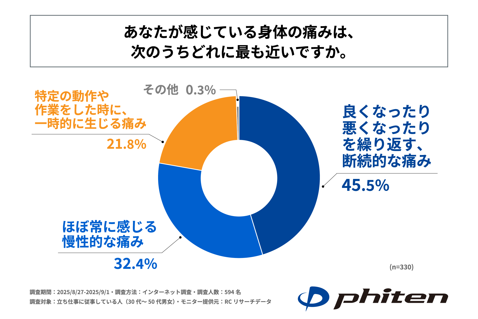 続いて、立ち仕事が原因と考えられる身体の痛みを抱えていると回答した人を対象に「自身が感じている身体の痛みで、最も近いもの」を尋ねる設問への回答では、1位が「良くなったり悪くなったりを繰り返す、断続的な痛み」で45.5%、2位が「ほぼ常に感じる慢性的な痛み」で32.4%、3位が「特定の動作や作業をした時に、一時的に生じる痛み」で21.8%という結果になりました。この結果から、立ち仕事が原因と考えられる身体の痛みとして最も多いのは、良くなったり悪くなったりを繰り返す断続的な痛みであることがわかりました。