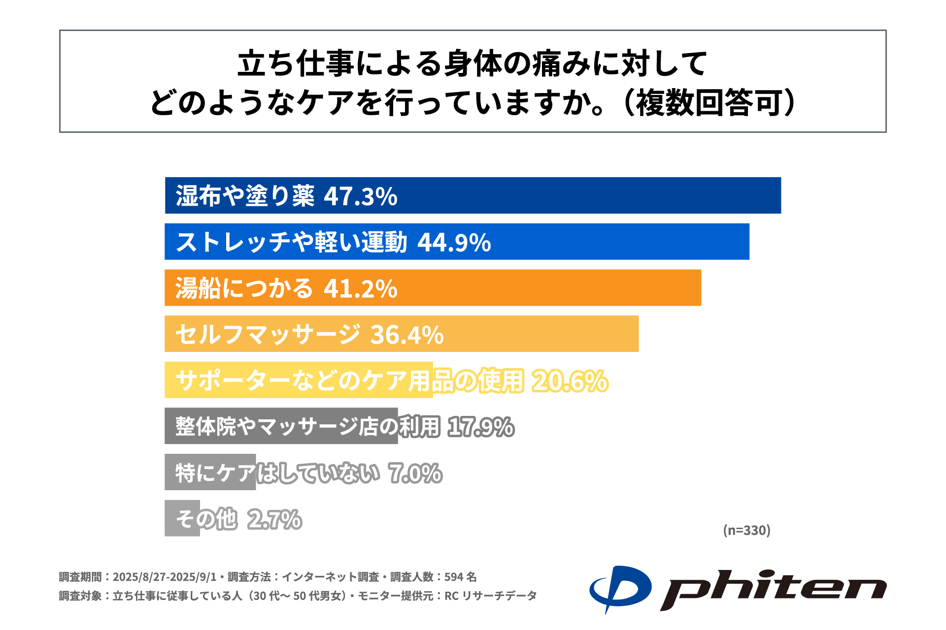 また、立ち仕事が原因と考えられる身体の痛みを抱えていると回答した人を対象に「立ち仕事による身体の痛みに対してどのようなケアを行っているか」を尋ねる設問への回答では、1位が「湿布や塗り薬」で47.3%、2位が「ストレッチや軽い運動」で44.9%、3位が「湯船につかる」で41.2%という結果になりました。この結果から、立ち仕事による身体の痛みに対して行っているケアは、日常生活の中で手軽に取り入れられることが上位の回答に並ぶ形となりました。