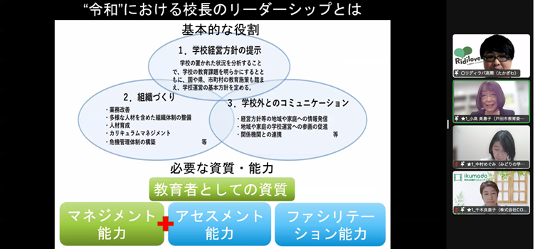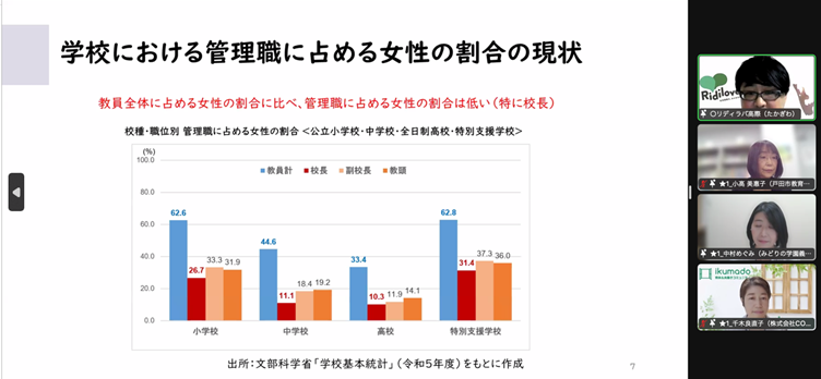最終申込者は360名となり、オンラインにて、女性管理職を含む多様なリーダーの必要性、実際に女性管理職比率を向上していくための、具体的な教育委員会事例や、ロールモデルの経験談に関するセッションが設けられました。