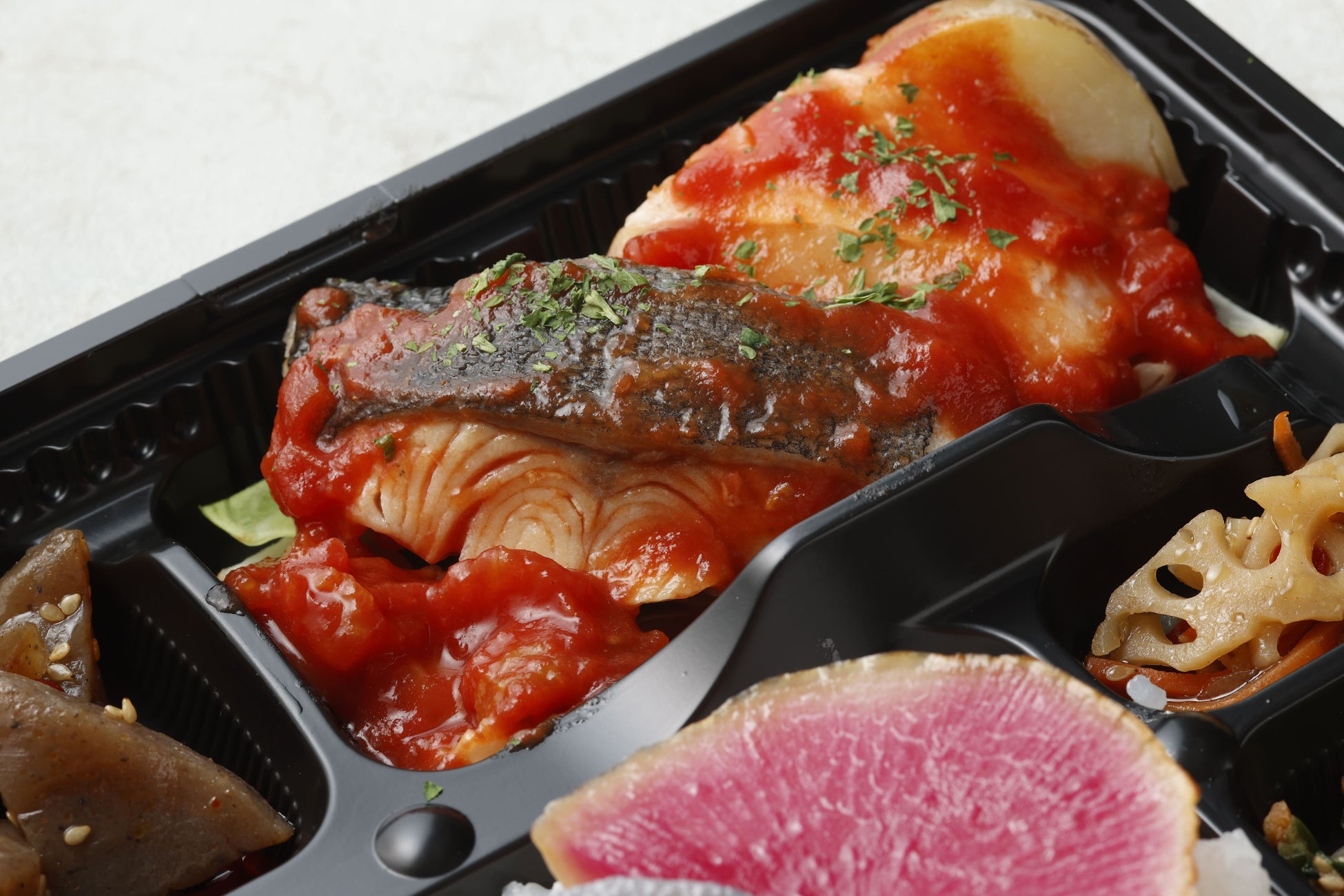 トマトソースで煮込んだアラスカ産銀だらとアラスカ産アブラガレイがメインの一品。魚の旨みが溶け出したトマトソースが食欲をそそる、ボリュームたっぷりDX弁当です。