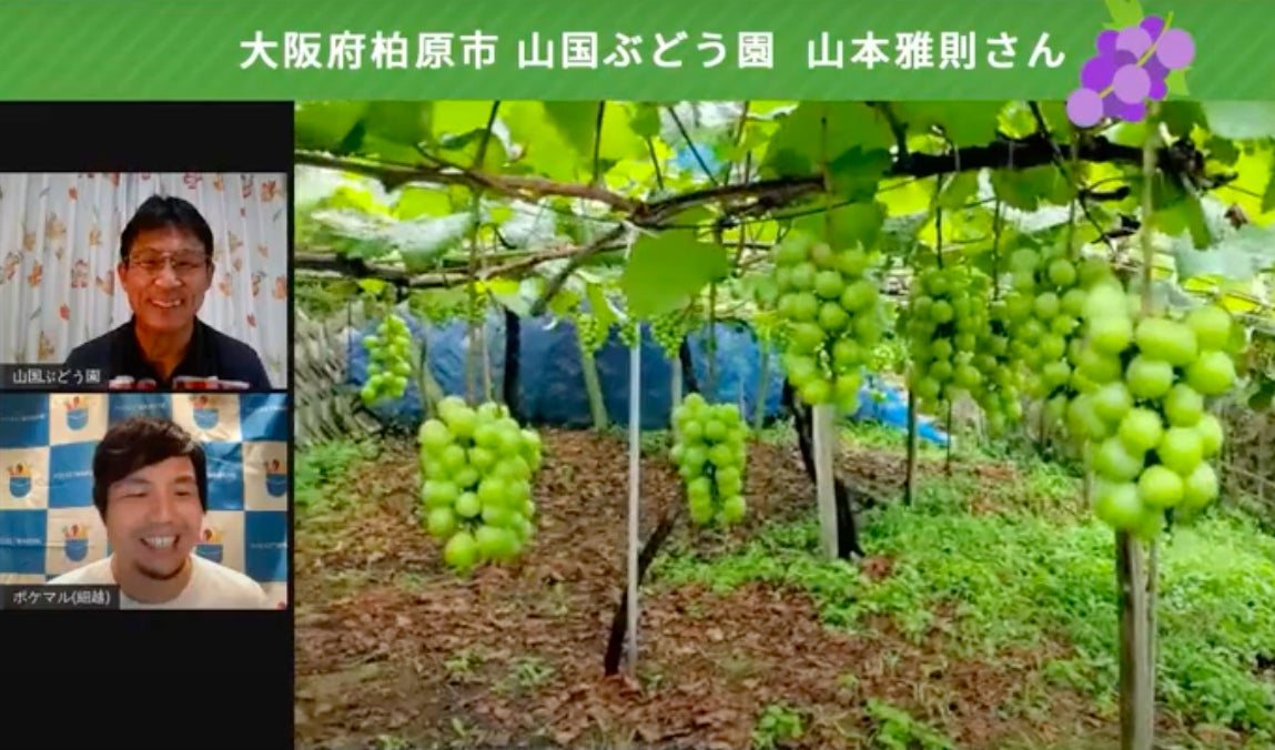 当社の「食を通じた関係人口創出事業」の一環として、大阪府柏原市と連携して実施しました。「現地に行きたくなるライブコマース」をコンセプトに、柏原市の特産品「柏原ぶどう」を栽培する2名の生産者が、食材や地域の魅力、生産へのこだわりを伝えながら、数量限定のセット商品を販売しました。