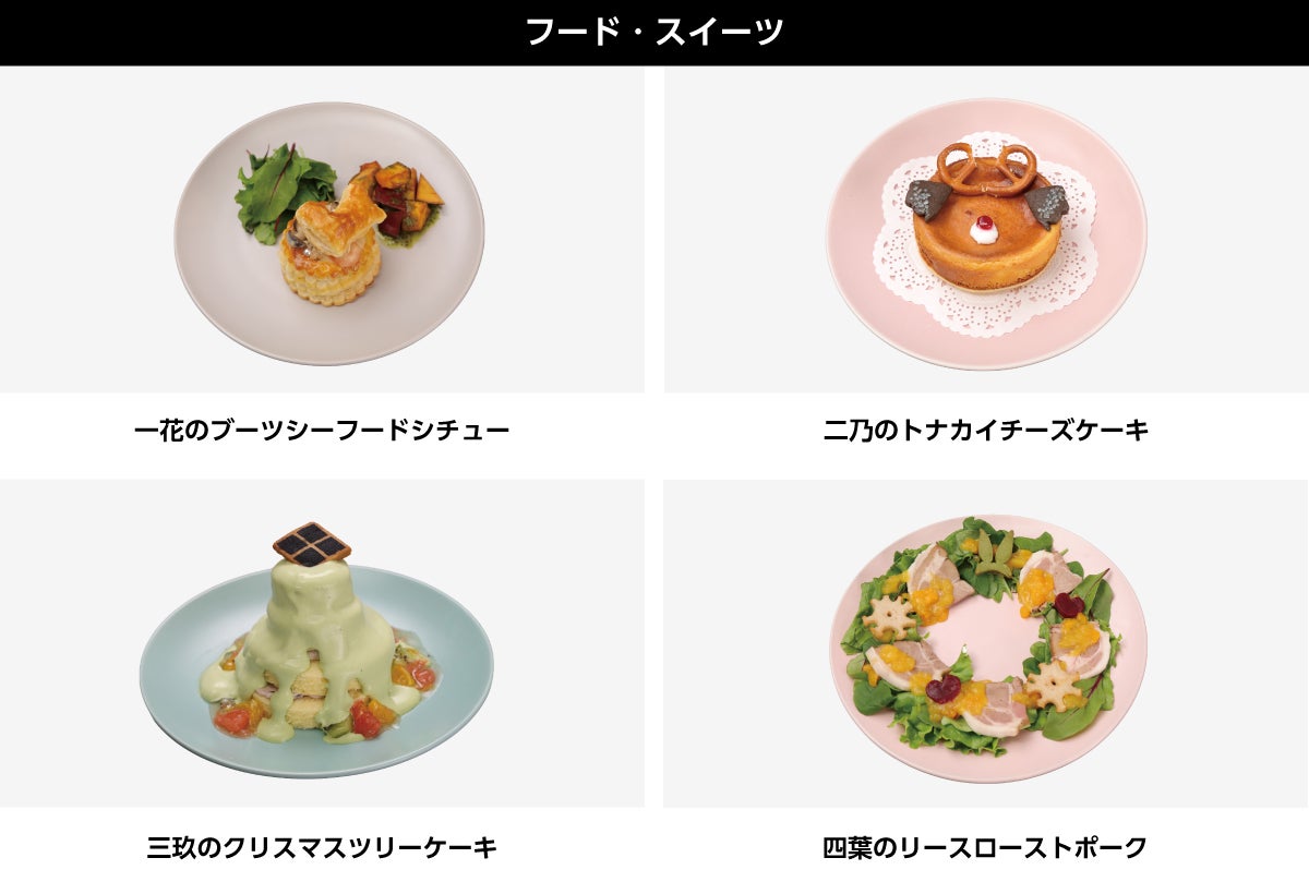 一花の好物である塩辛が入ったシーフードシチューをたっぷりと詰めたパイブーシェや、五月の好物である肉をお腹いっぱい楽しめるフライドチキンなど、クリスマスにぴったりのオリジナルメニューが盛りだくさん!キャラクター達が、クリスマスをイメージした衣装に身を包んだオリジナルイラストを使用した限定グッズも多数登場します。