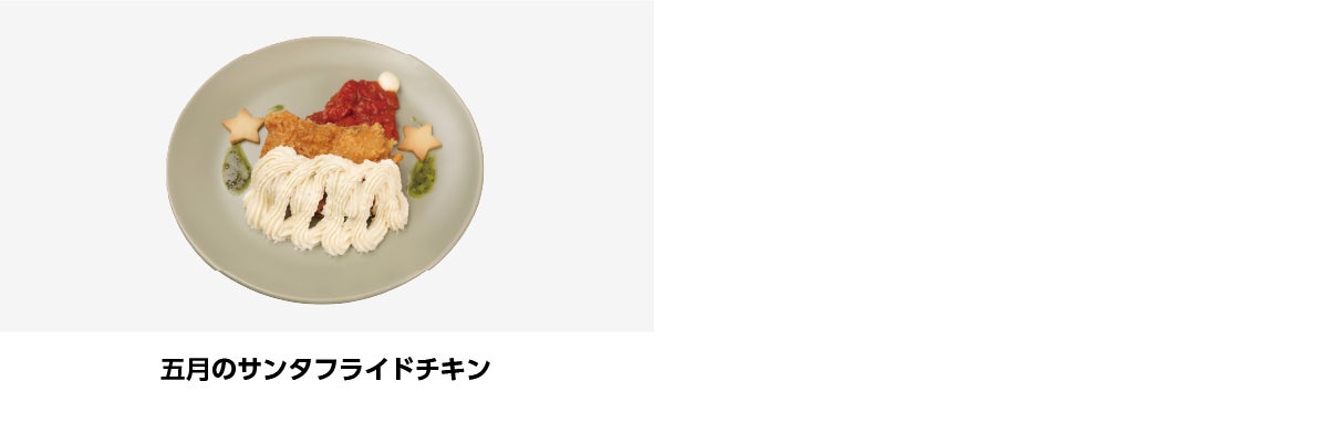 五月をイメージしたフライドチキンです。カレー味のフライドチキンに、白いひげに見立てたマッシュポテトクリームと、赤い帽子に見立てたミニトマトソースで、サンタクロースのデコレーションをし、五月の好物である肉をお腹いっぱい楽しめるプレートに仕上げました。五月のチャームポイントの星のチャームのクッキーを飾って仕上げています。